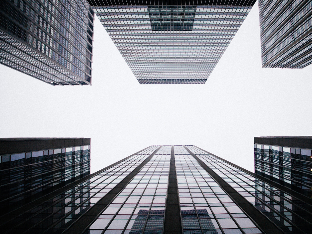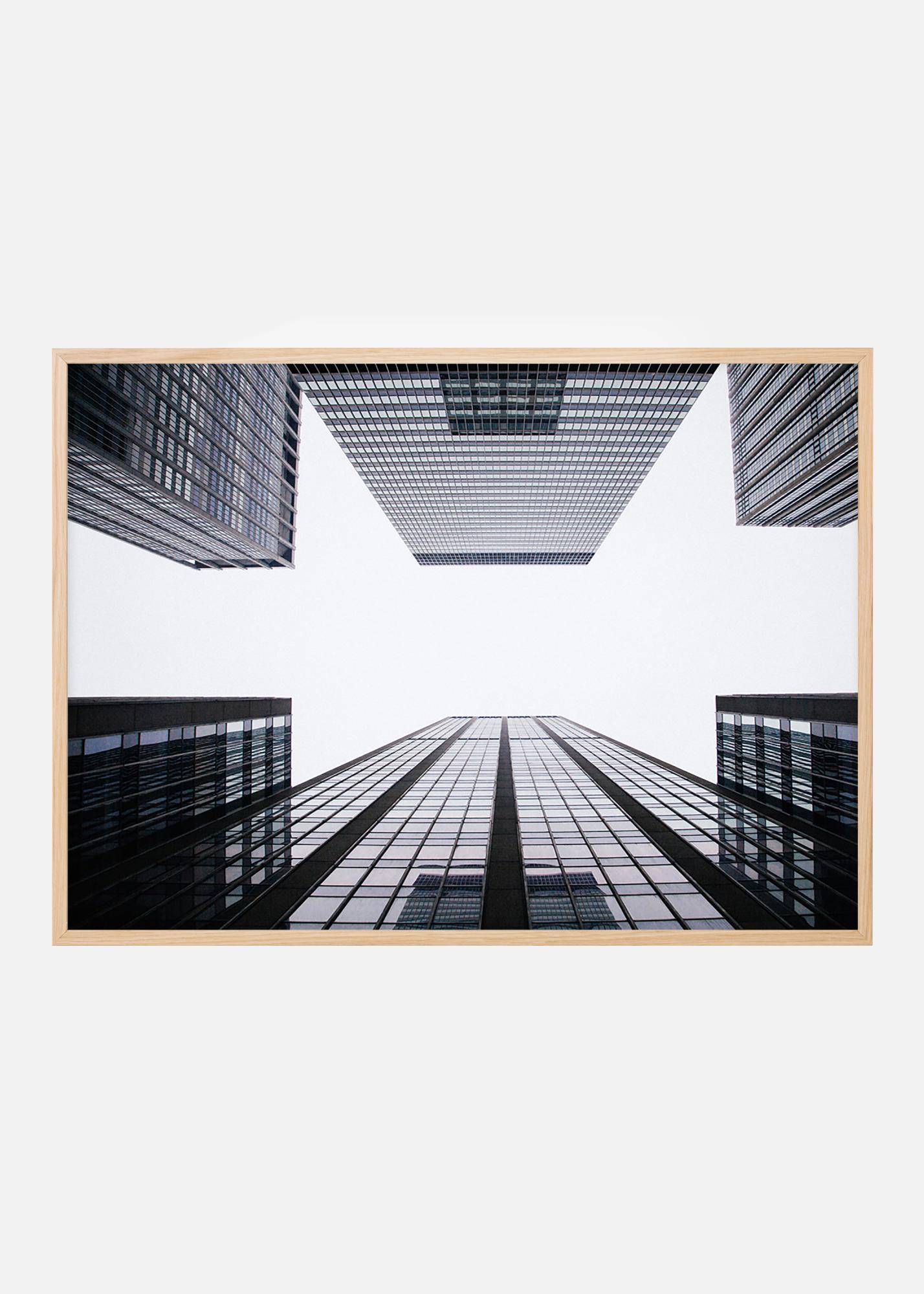 Póster de arquitectura con rascacielos en crecimiento hacia un cielo blanco como las nubes. Imagen elegante de edificios oscuros sobre un fondo blanco, con reflejos del cielo en los cristales. Un regalo perfecto para aquellos a quienes les gustan los retratos gráficos de edificios. La impresión se ve bien en un marco negro que resalta la oscuridad de la imagen y queda bien en combinación con otras fotografías de arquitectura.