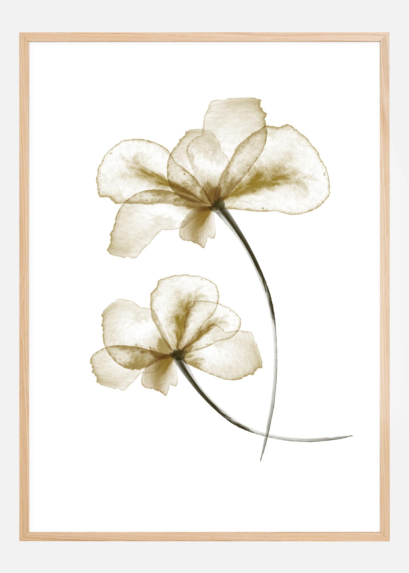 Un póster sencillo pero elegante con dos flores blancas sobre un fondo blanco. En la parte inferior de la impresión, las flores se superponen de manera hermosa, lo que le da un toque delicado a la lámina. La transparencia de los tonos marrones y beige suaves se vería perfecta en una pared color crema.
