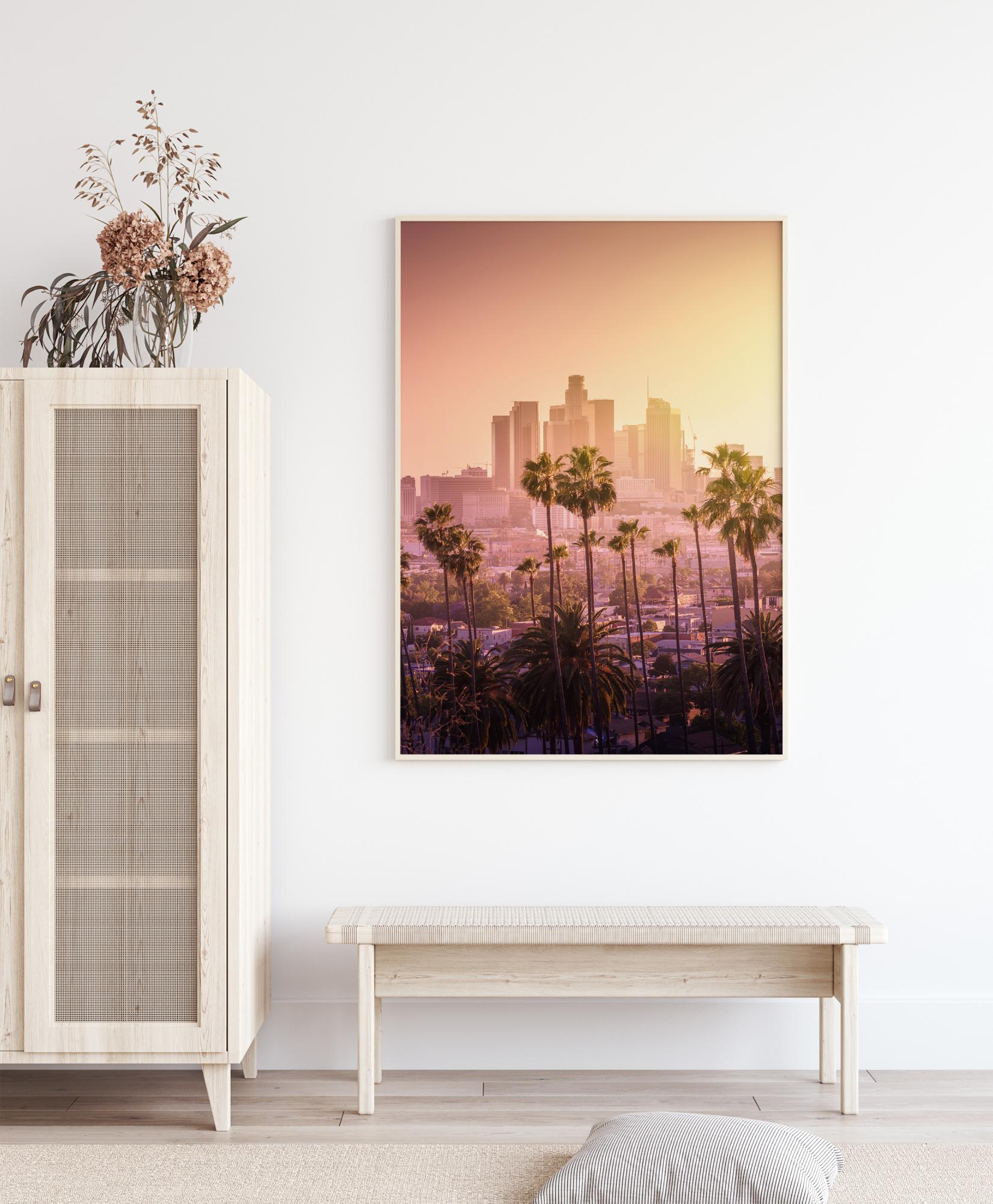 Una vista de una ciudad tomada a distancia. En primer plano, las altas palmeras dominan la imagen, mientras que los rascacielos en la distancia observan la ciudad. El cielo de color naranja y lila se refleja en los edificios de la ciudad y les da un aspecto lila. Un póster perfecto para todos los amantes de la arquitectura.