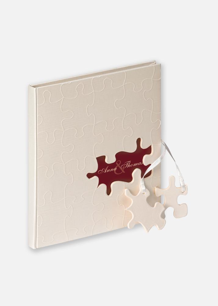 Libro de visitas con cubiertas de lino blanco y rojo. En la portada del libro de visitas hay espacio para una imagen personal o el nombre de la pareja de novios. También disponible como álbum de bodas a juego para tus fotos de boda.