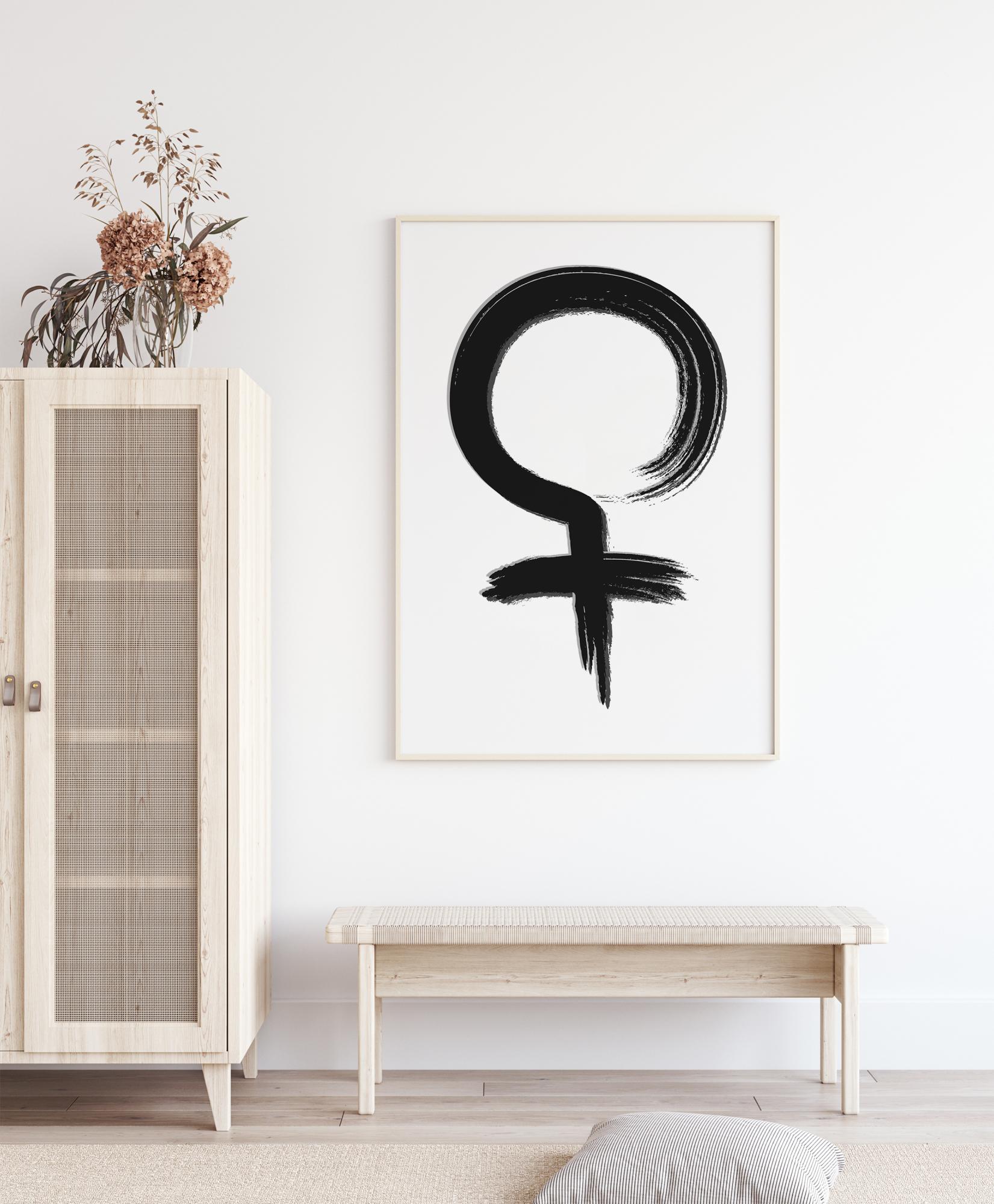 Una sencilla impresión en blanco y negro que ilustra el símbolo de la mujer con un círculo incompleto. Sobre un fondo blanco, el símbolo negro se desvanece hacia el final del anillo. Un póster perfecto para colgar en un entorno femenino.