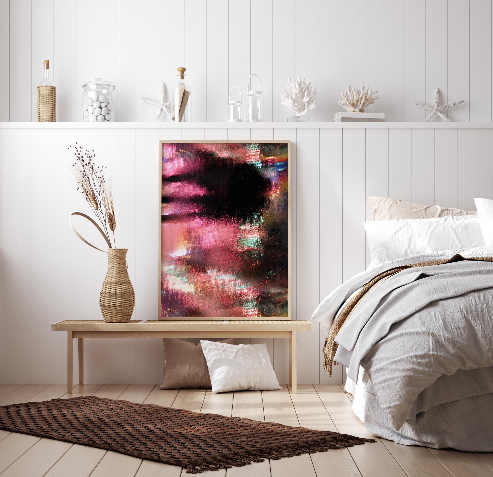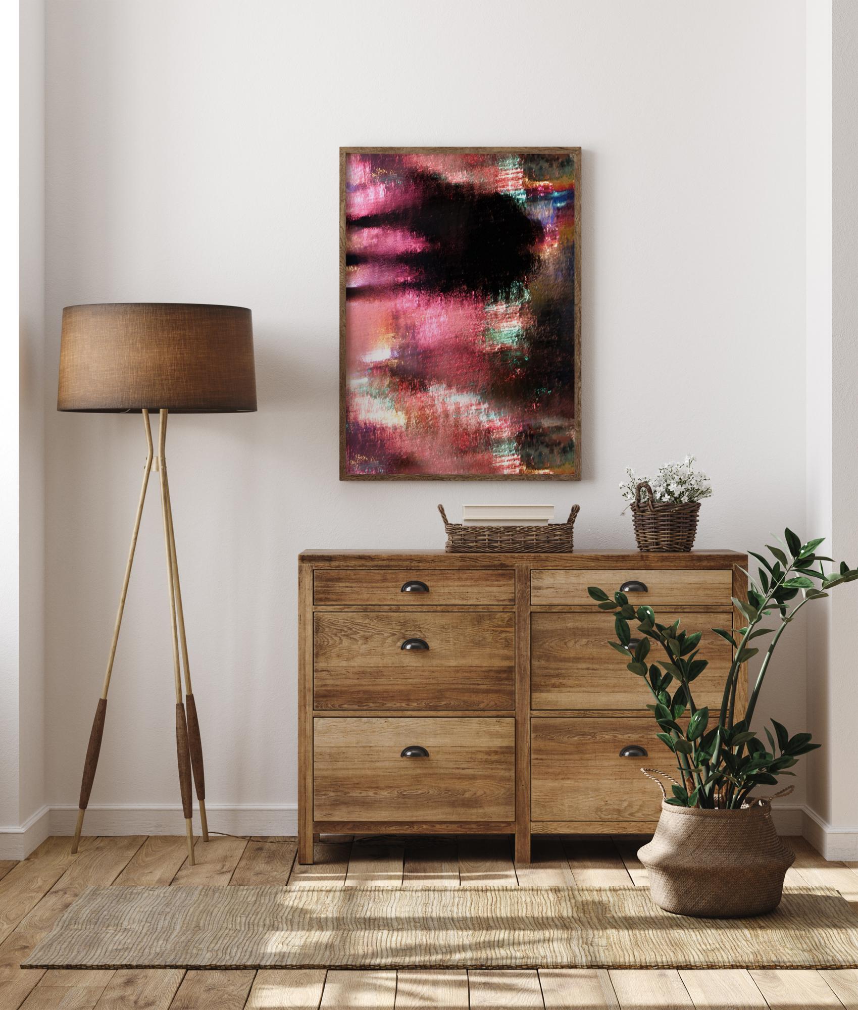 Una mezcla perfecta de colores con tonos rosados domina esta impresión multicolor. En la parte superior del póster hay una zona negra que crea una sensación de profundidad. A la derecha de la zona negra hay una forma de tubo vertical en rojo y verde. Un póster perfecto para dar un toque de color a una pared neutral.