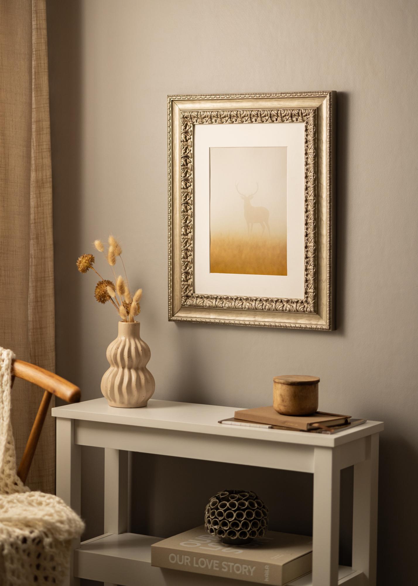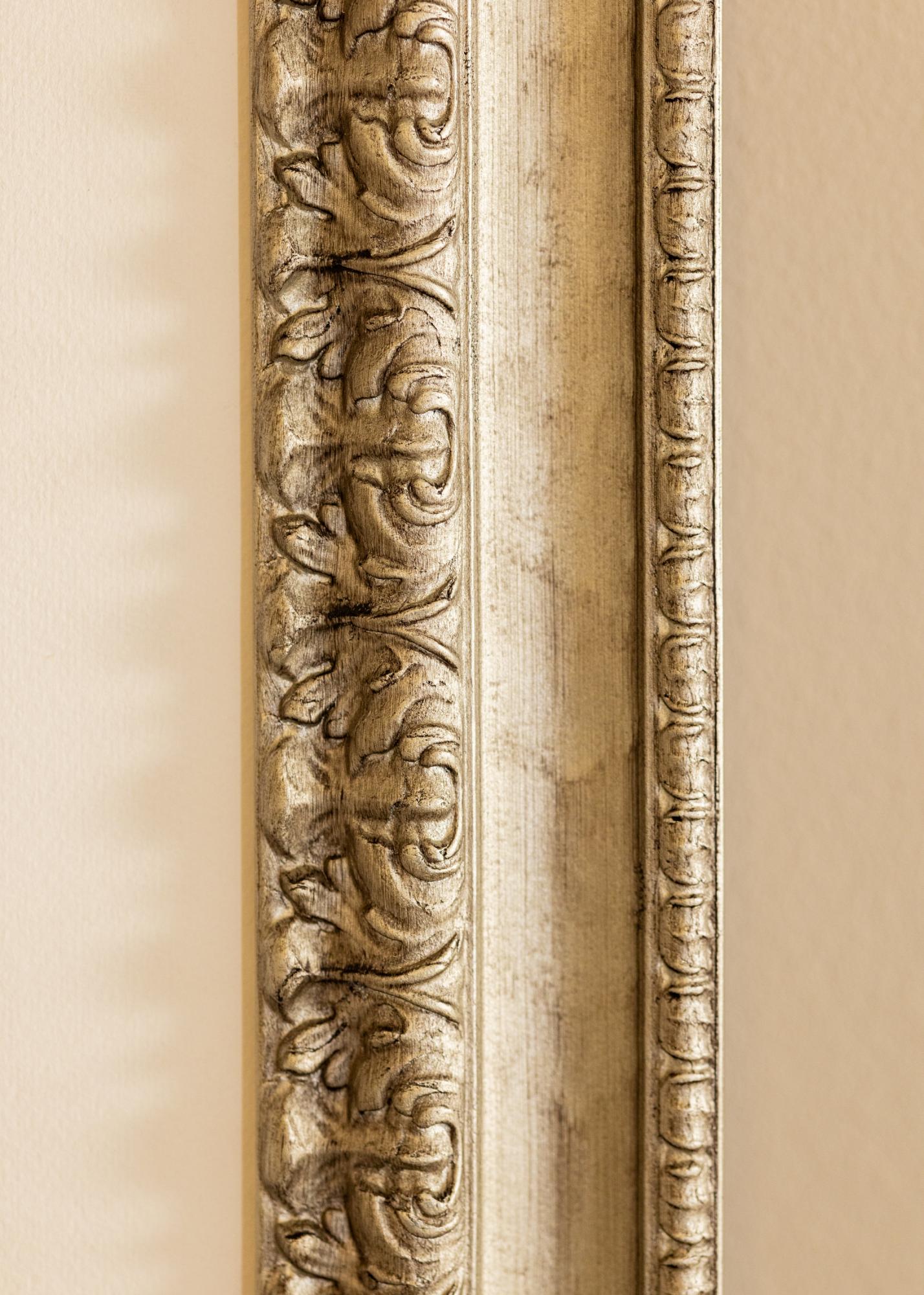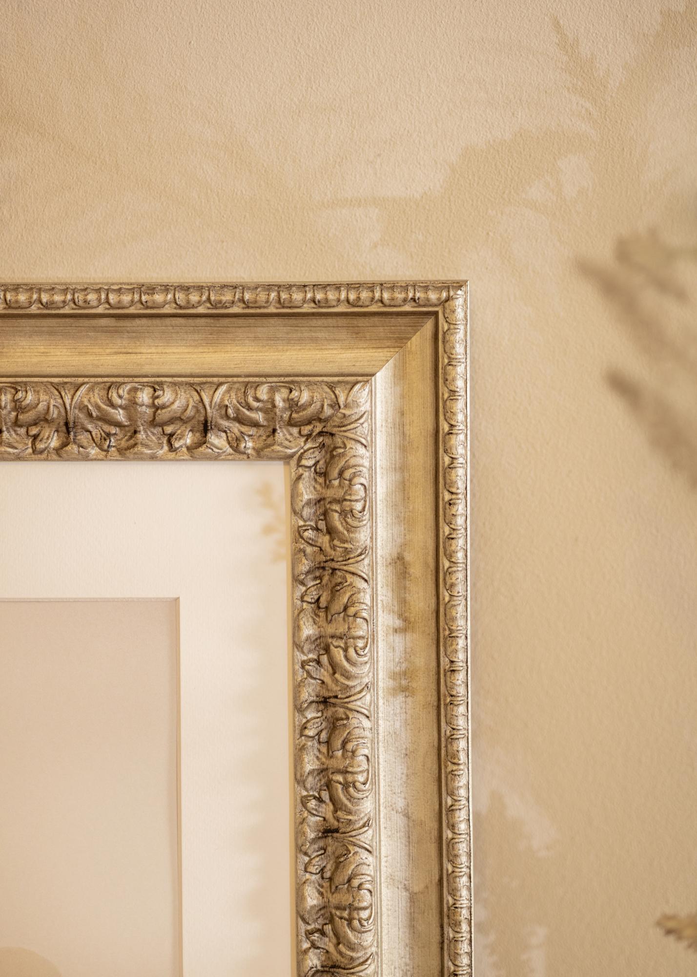 Este marco hecho a medida está fabricado de madera y tiene un tono dorado antiguo con una superficie ligeramente patinada. Esto refuerza la sensación clásica y hace que el marco sea perfecto tanto para decoraciones modernas como tradicionales. Los detalles ornamentales en relieve a lo largo del borde interior proporcionan una expresión sofisticada, mientras que el acabado cepillado resalta la profundidad del decorado y crea un sutil efecto envejecido.