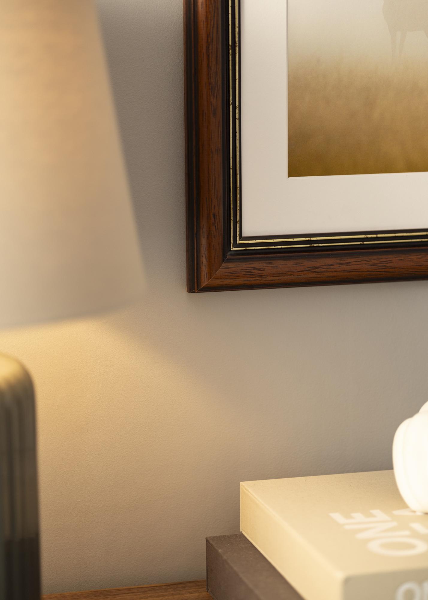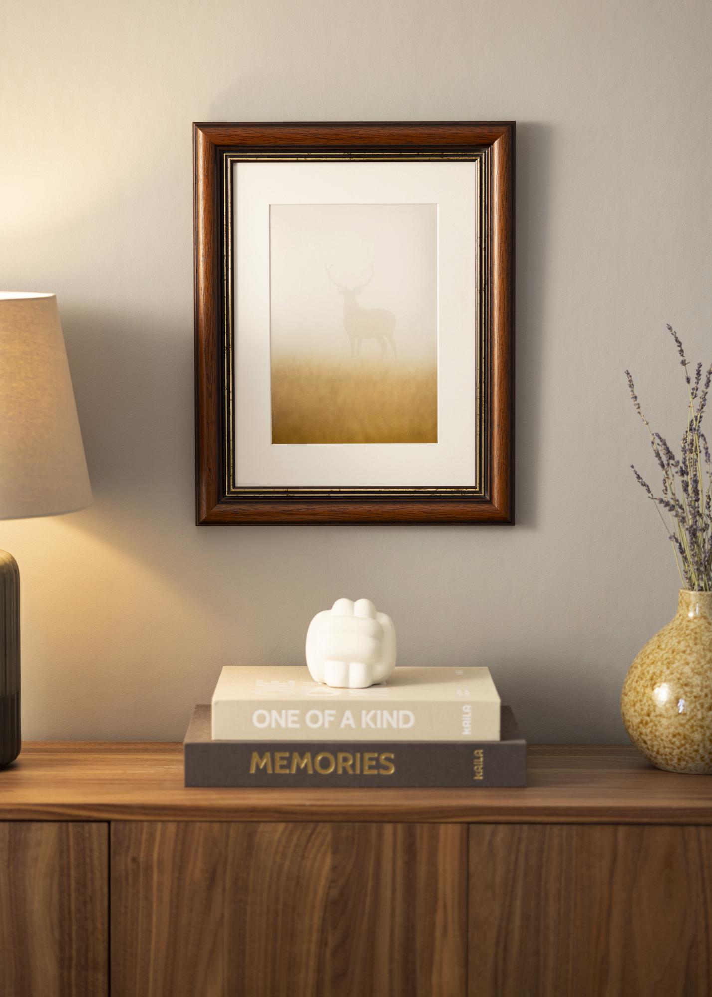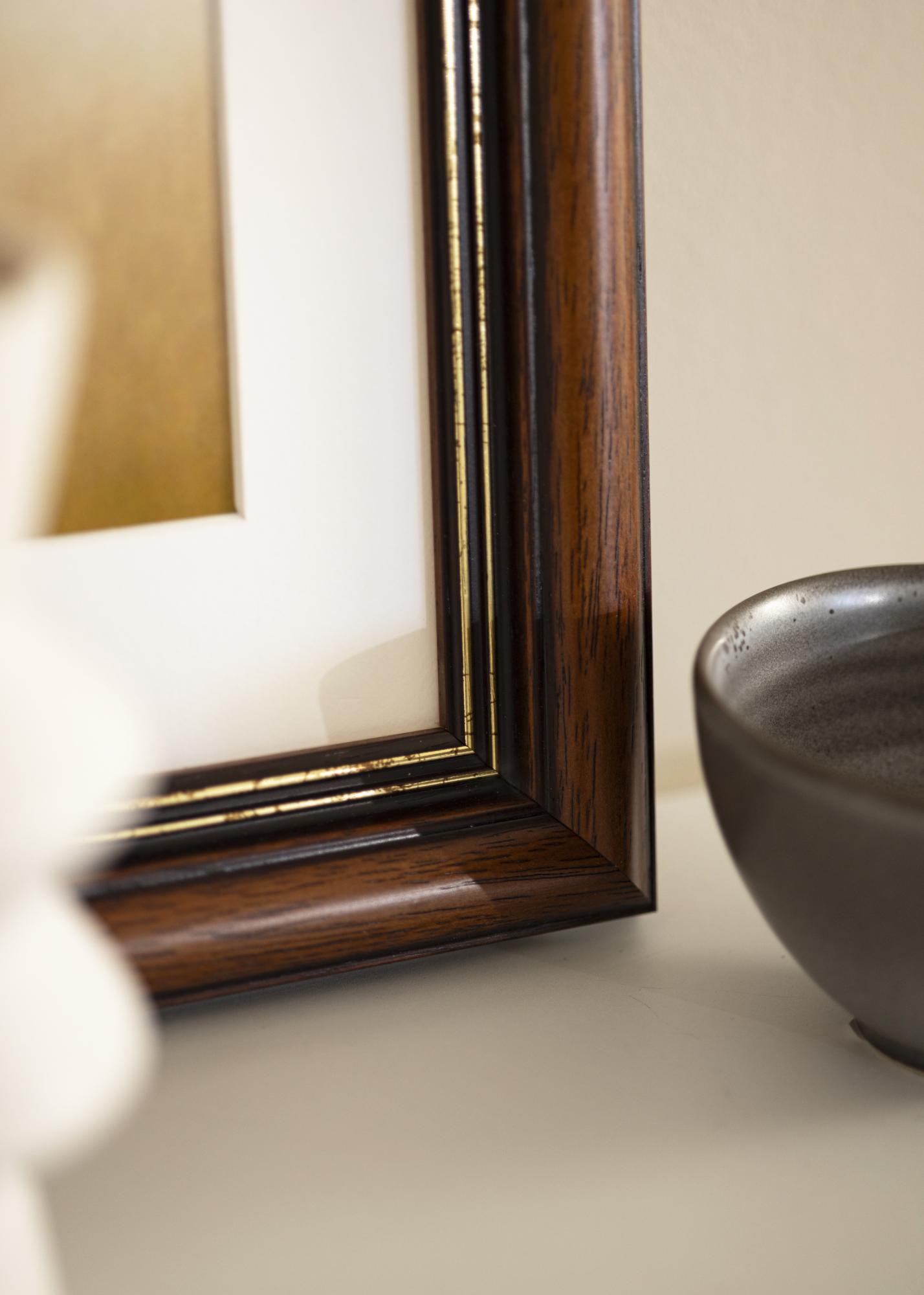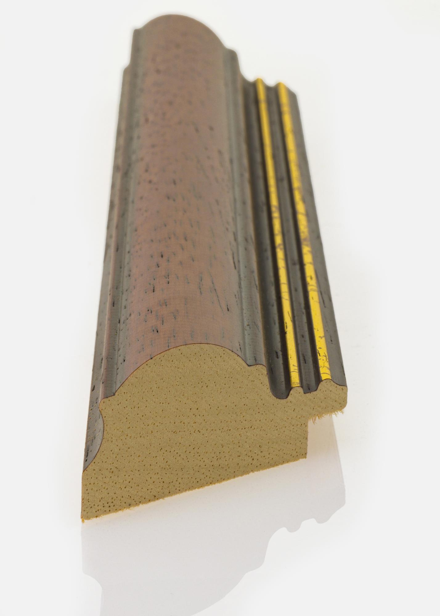 Orsa es un marco de fotos de estilo clásico con un perfil redondeado y ancho. El color base del marco es marrón con toques negros combinados con dos líneas doradas cerca de la imagen. El marco incluye vidrio y respaldo.