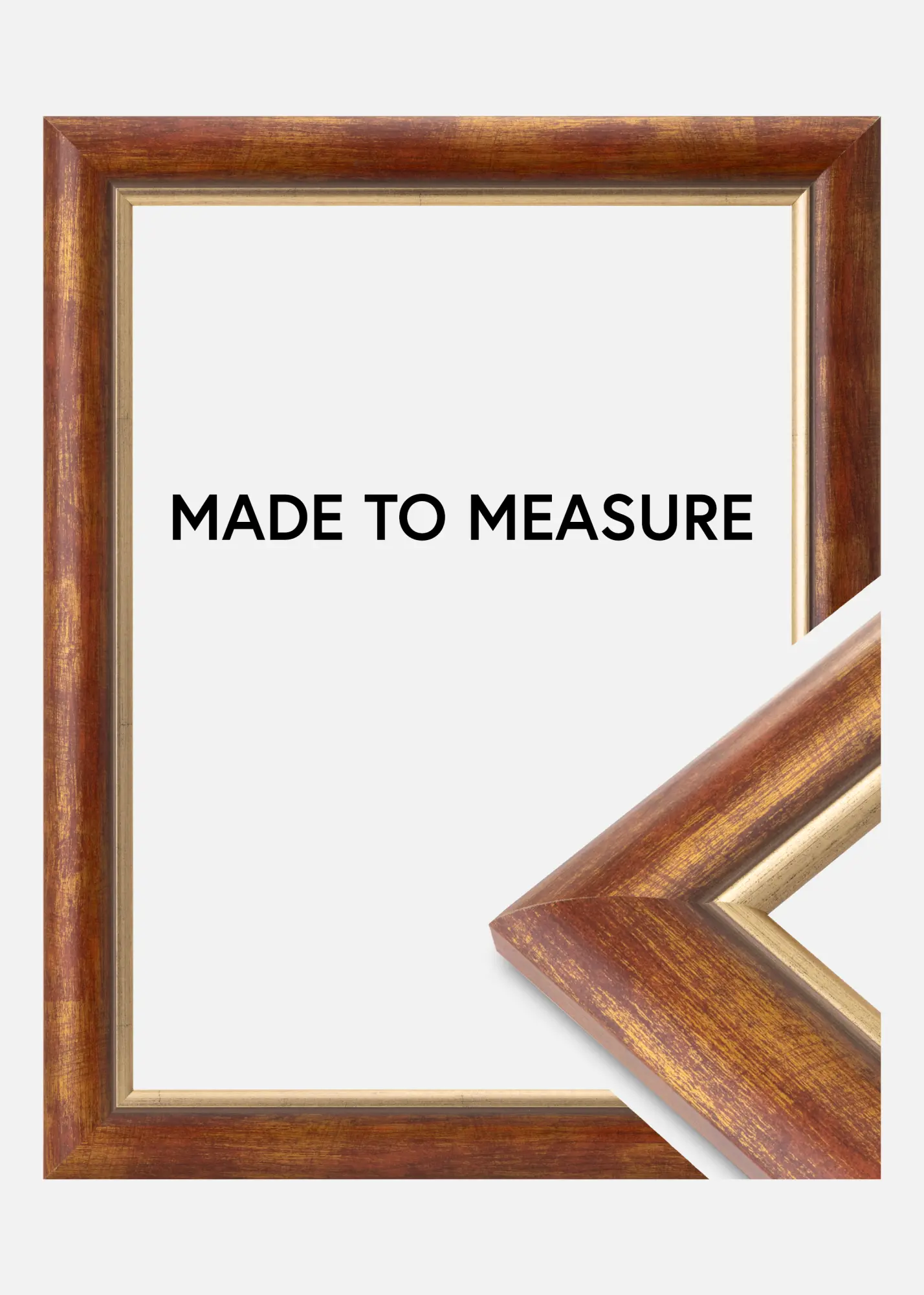 Marco de madera atemporal fabricado en Finlandia con una superficie de madera de tono rojo y un borde dorado cerca de la imagen. Brinda una sensación armoniosa a la imagen. El marco tiene un perfil ancho de 41 mm y una profundidad de 19 mm, lo que le da una mayor profundidad al enmarcado.