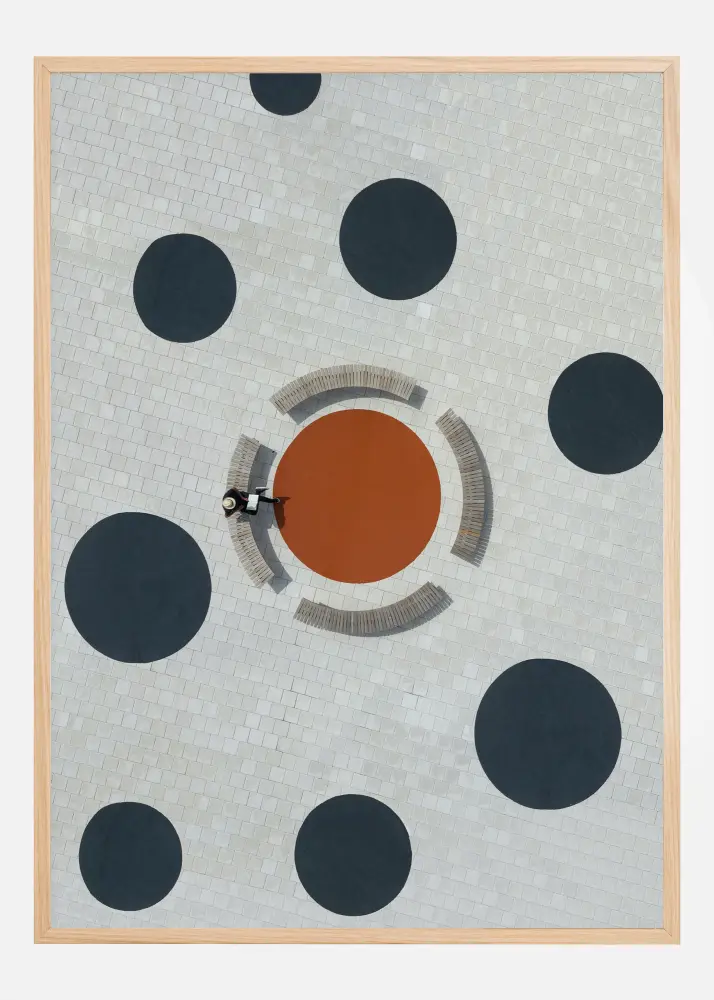 Este póster conceptual captura una imagen distintiva a vista de pájaro de una persona leyendo rodeada por una composición simétrica y gráfica. El diseño abstracto de la superficie revestida de blanco, salpicada con grandes círculos negros y un círculo central color óxido con bancos proporciona un fuerte contraste visual. Este cartel no solo es un homenaje al diseño y la arquitectura, sino también una interpretación lúdica de escenas cotidianas.