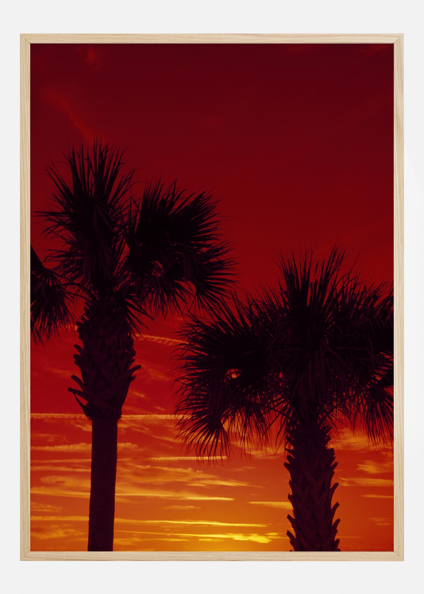 Un póster con dos palmeras en silueta contra un cielo rojo profundo que crea una sensación misterioso. El atardecer es amarillo en la base y se vuelve rojo oscuro al pasar por la cima de las palmeras. Esto crea una apariencia dramática que hará que tu corazón se acelere cuando combines esto con una pared neutral.