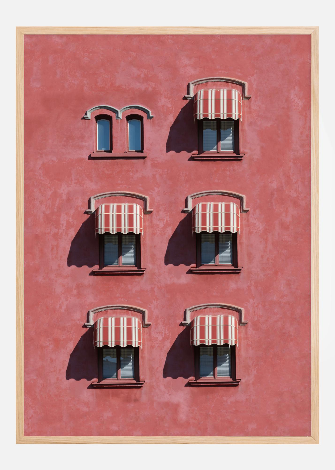 Este elegante y sofisticado póster, "Red Wall", es una exhibición de armonía arquitectónica y equilibrio visual. Seis ventanas, cada una con un toldo distintivo, adornan la vibrante fachada roja y brindan una simetría rítmica que es tanto calmante como satisfactoria para el ojo. El juego travieso del sol sobre la superficie da vida a la estructura y crea un juego entre luz y sombra.