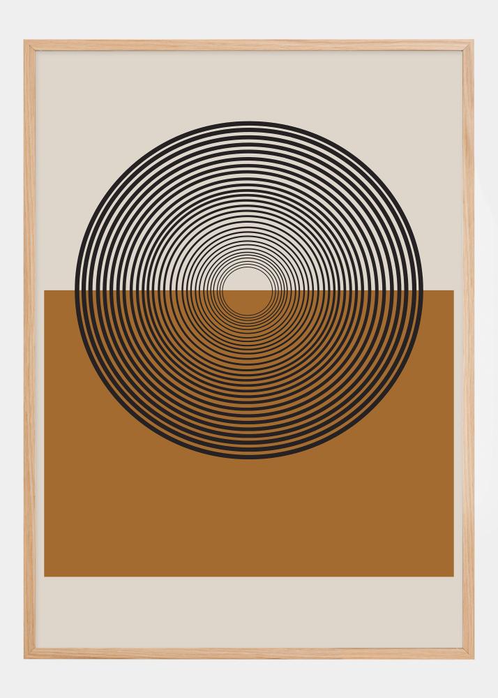 Este elegante póster atrae la atención con su hipnótico patrón de líneas negras que forman una exquisita ilusión óptica, colocadas sobre un rico fondo ocre que representa un horizonte de paisaje. La mitad superior de la forma circular da una sensación de puesta de sol o salida de luna, mientras que las líneas onduladas crean una sensación de movimiento y profundidad, otorgando a esta obra de arte un aire retro con un toque moderno.