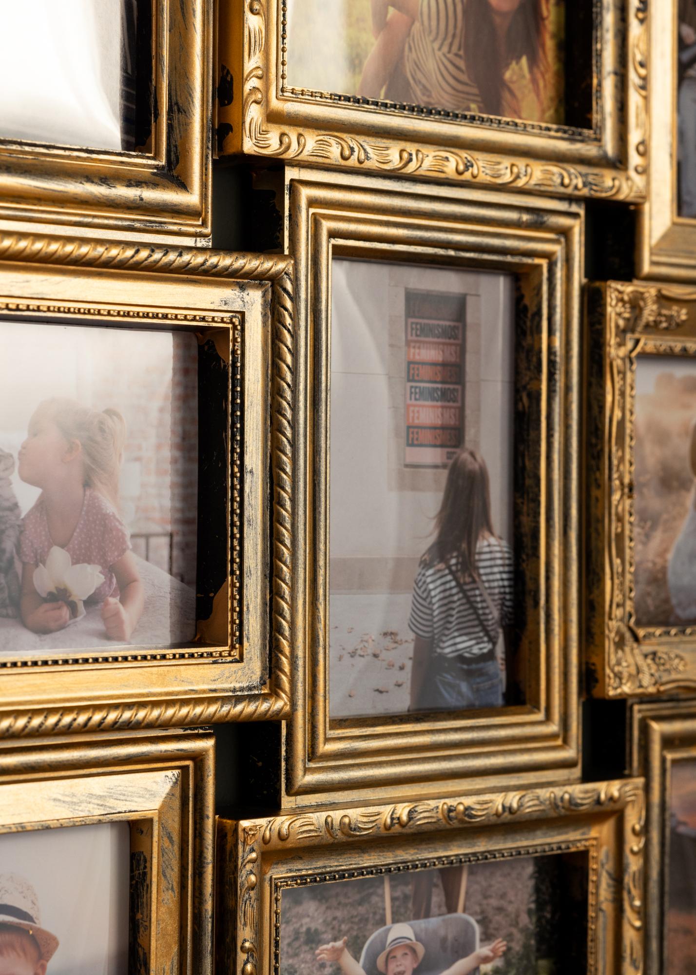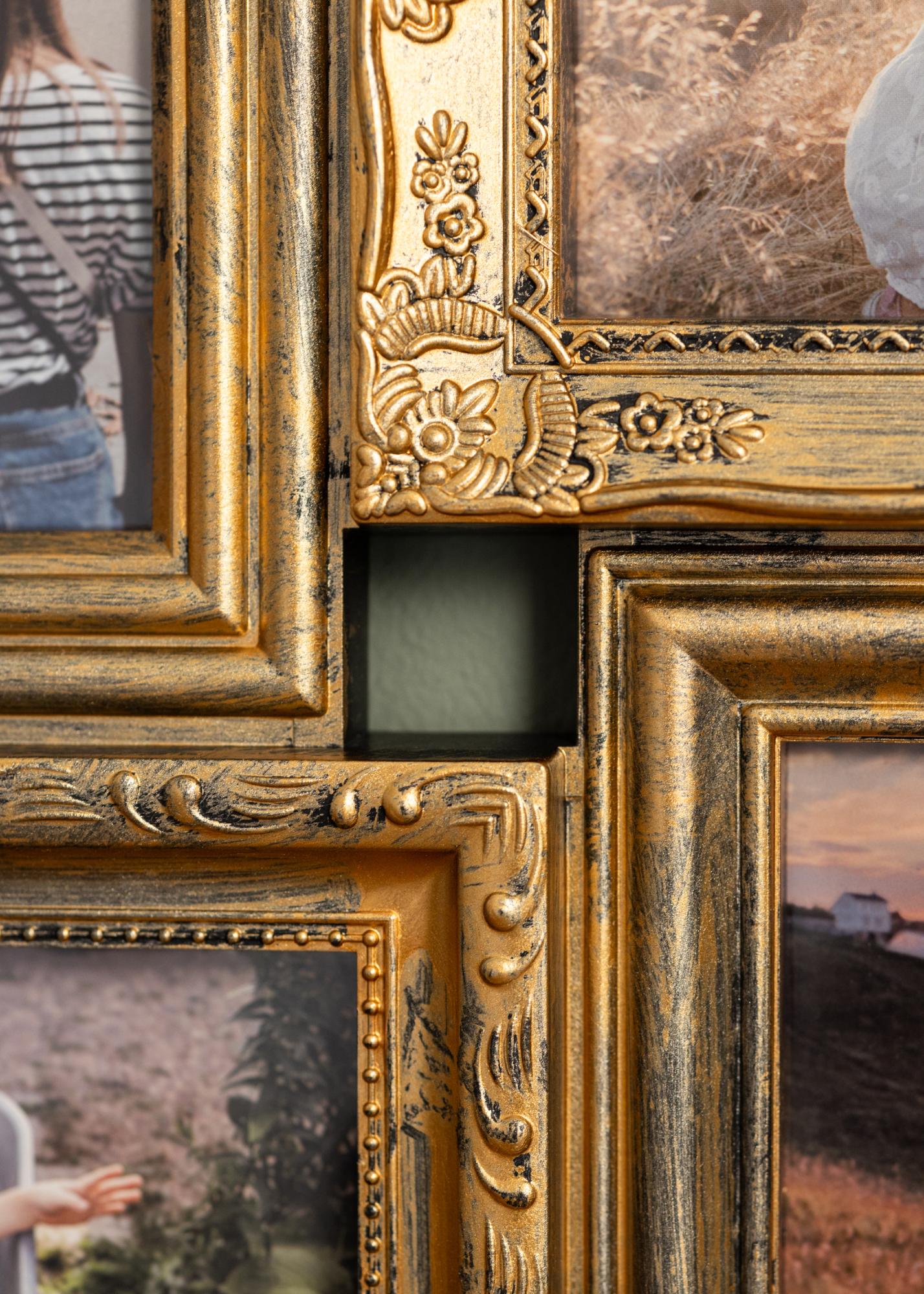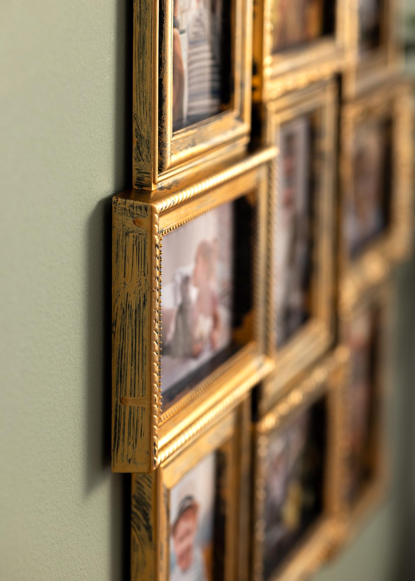 ¿Estás buscando un marco dorado en un hermoso estilo retro con espacio para todas tus fotos favoritas? Este marco collage tiene capacidad para 12 fotos en formato vertical y horizontal, colocadas simétricamente en marcos adyacentes.