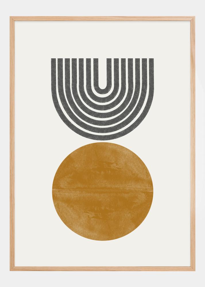 Este póster inspirado en el retro combina precisión geométrica con curvas orgánicas, creando una sensación de movimiento y encanto retro. El gran objeto circular de color ocre en la parte inferior proporciona una base sólida, mientras que los arcos en blanco y negro arriba recuerdan a ondas sonoras o un paisaje abstracto, lo que ofrece un contraste interesante y profundidad.