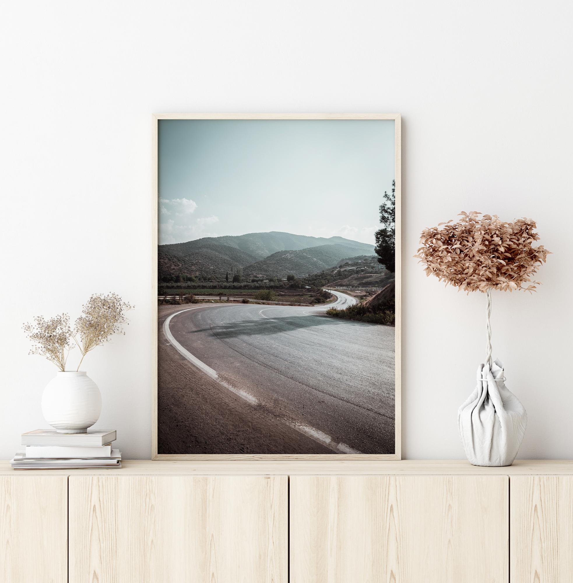 Un hermoso póster con un camino serpenteante a través de las montañas. Un solitario camino de asfalto se desliza hacia adelante en la distancia hacia las cumbres remotas de las montañas. Los colores son suaves y recuerdan a un día de primavera cuando se conduce con el techo abajo. Obtén esa sensación ligera y aireada con este póster.
