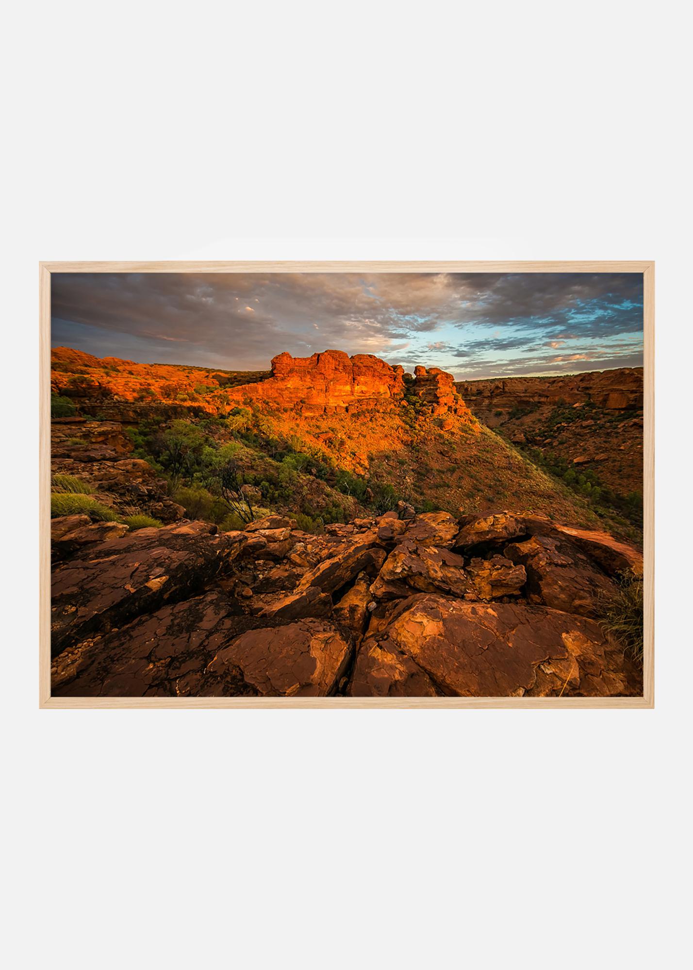 Póster con fotografía de montañas rojas y áridas al atardecer, ideal para aquellos a quienes les gustan los desiertos y formaciones rocosas para colgar en la pared. Los tonos cálidos y rojos contrastan con el cielo azul hielo y la profundidad de la imagen crea un motivo interesante. Enmarca el póster con un elegante marco fotográfico y colócalo en una pared junto con otros motivos desérticos.