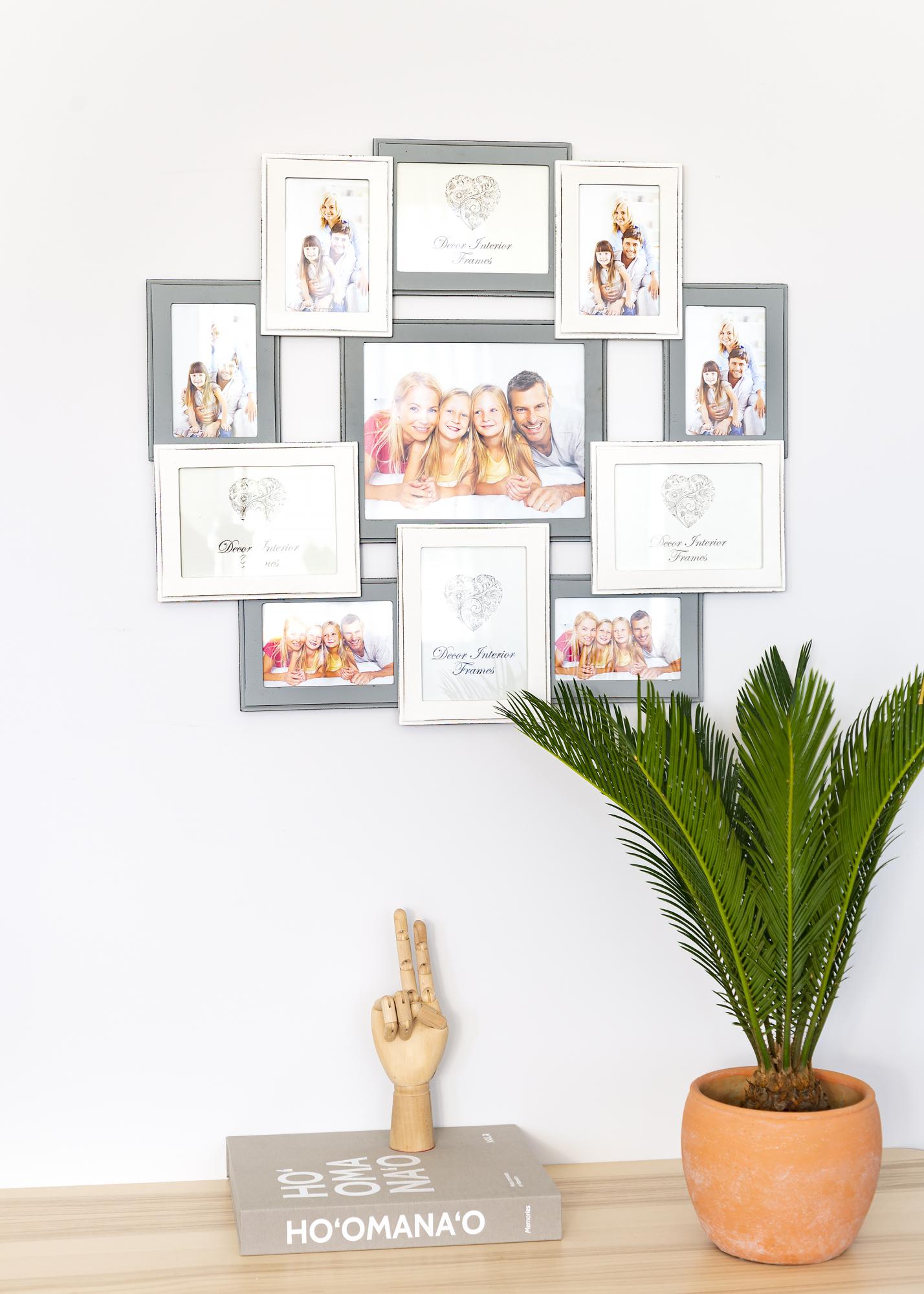 Si estás buscando un marco collage resistente con espacio para muchas imágenes de diferentes tamaños, Rouen es uno de nuestros favoritos. Con espacio para una imagen grande de 20x25 cm y 10 imágenes más pequeñas, puedes crear los fotocollages que desees. Con su diseño atemporal en gris claro y blanco, este marco collage se adapta a casi cualquier lugar. El marco tiene soportes de pared para una fácil instalación en la dirección que se muestra en la imagen.