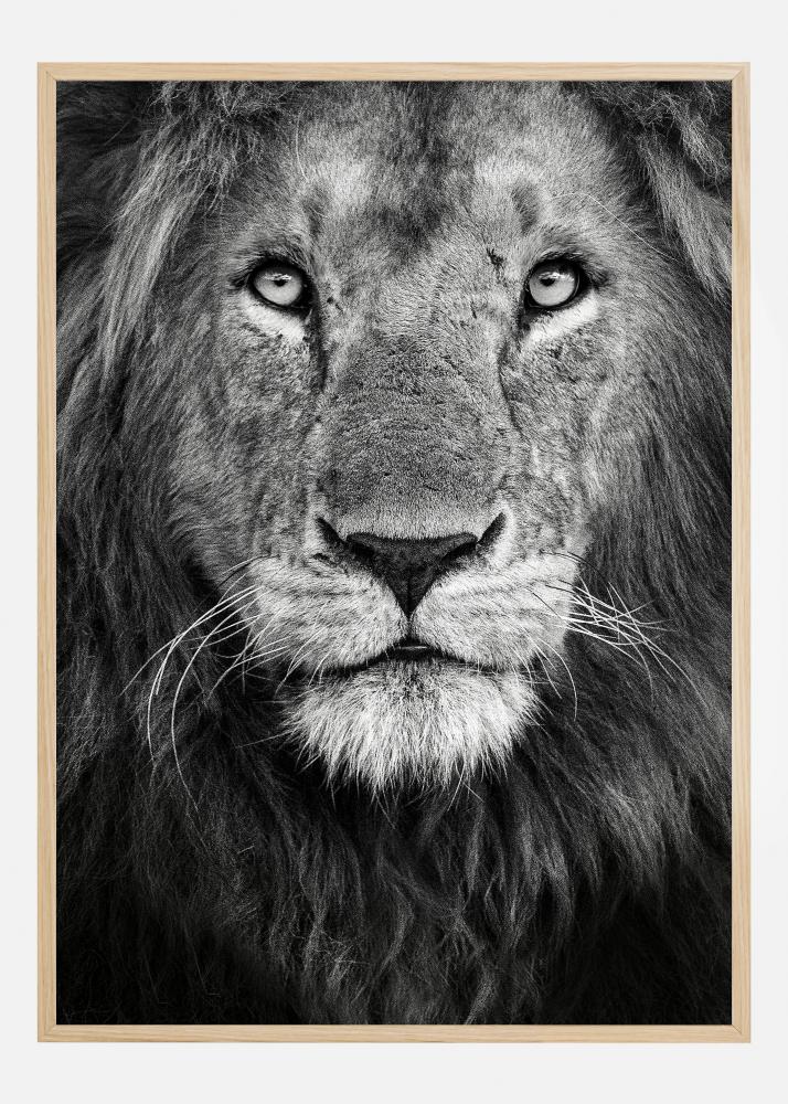 Este póster poderoso y expresivo presenta un retrato en primer plano de un león macho en blanco y negro, capturando la majestuosa presencia y la esencia salvaje del animal. La mirada intensa del león, su espesa melena y cada uno de sus bigotes cobran vida gracias al alto contraste y los detalles en la fotografía. Este es un motivo que atrapa inmediatamente el ojo y crea una impresión profunda y duradera.