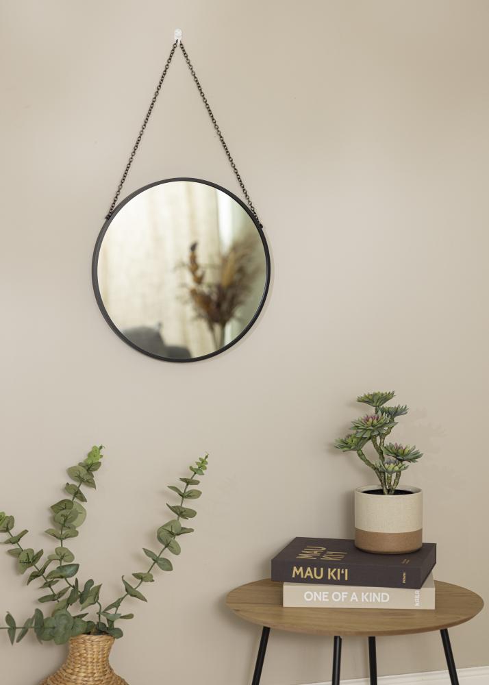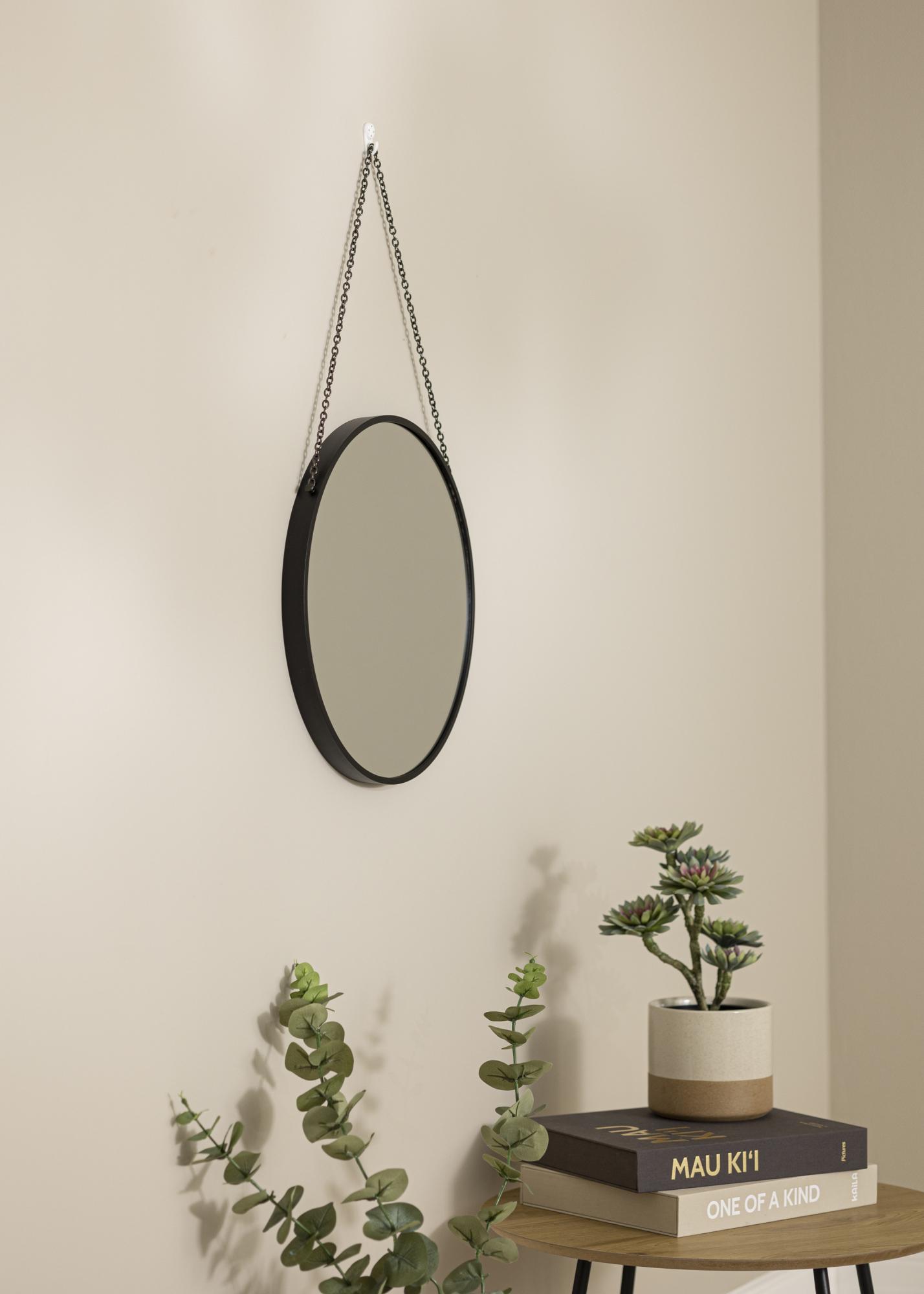 ¡Un espejo redondo es un clásico por una razón! Su forma suave crea una gran elegancia en tu hogar y contrasta con las líneas rectas de la decoración. Este es un modelo con un marco profundo de 28 mm y un elegante tono negro que se puede combinar fácilmente con otros detalles de decoración. El marco del espejo está hecho de metal. El espejo se cuelga con una cadena negra, lo que aumenta aún más la sensación de elegancia.