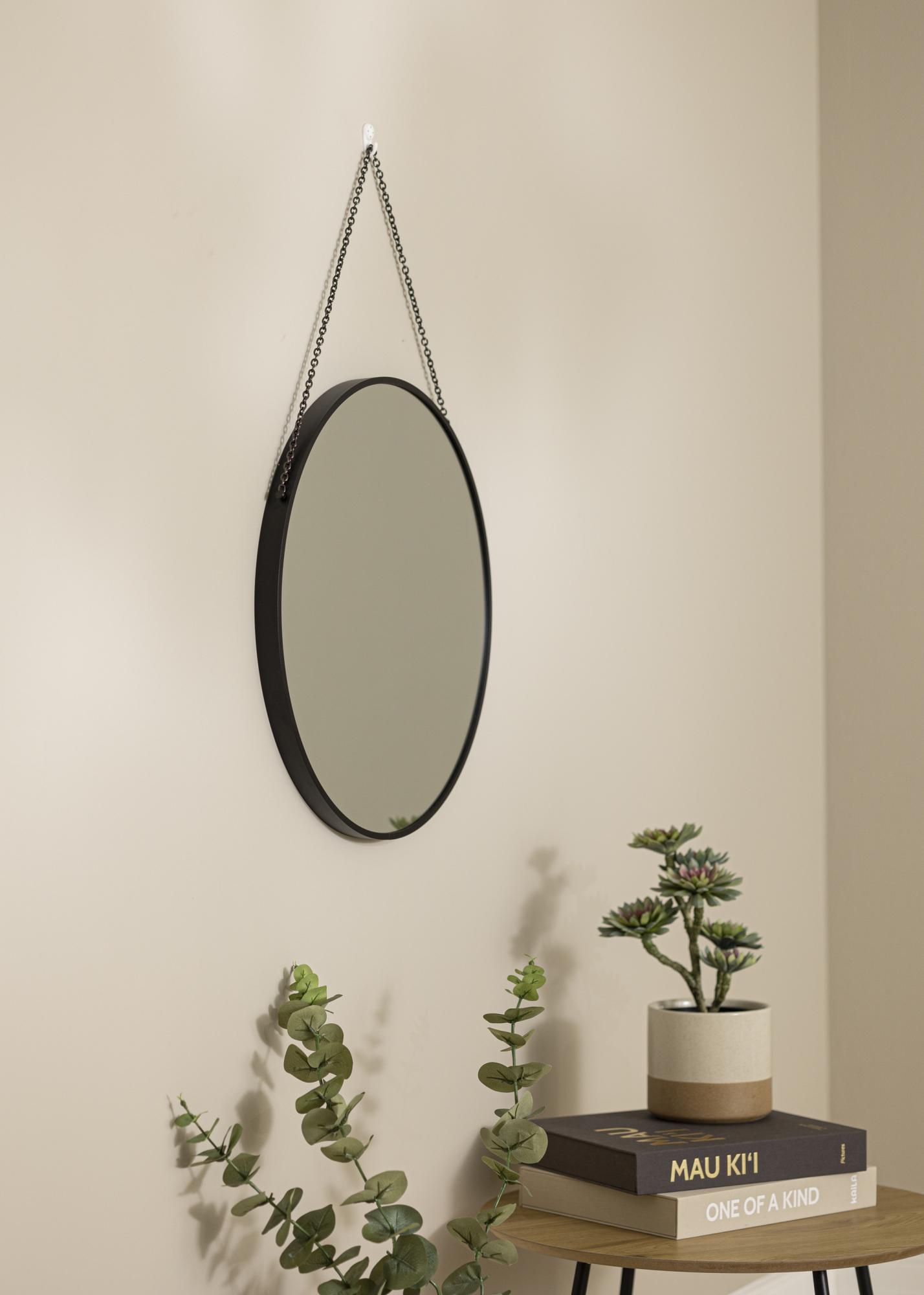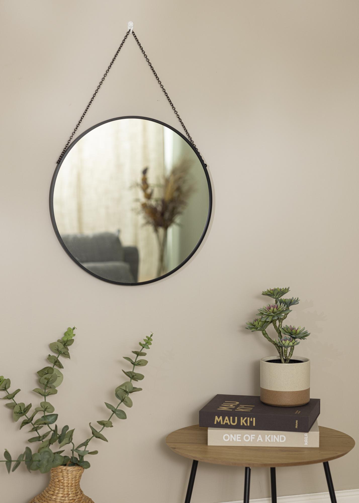 ¡Un espejo redondo es un clásico por una razón! Su forma suave crea una gran elegancia en tu hogar y contrasta con las líneas rectas de la decoración. Este es un modelo con un marco profundo de 28 mm y un elegante tono negro que se puede combinar fácilmente con otros detalles de decoración. El marco del espejo está hecho de metal. El espejo se cuelga con una cadena negra, lo que aumenta aún más la sensación de elegancia.