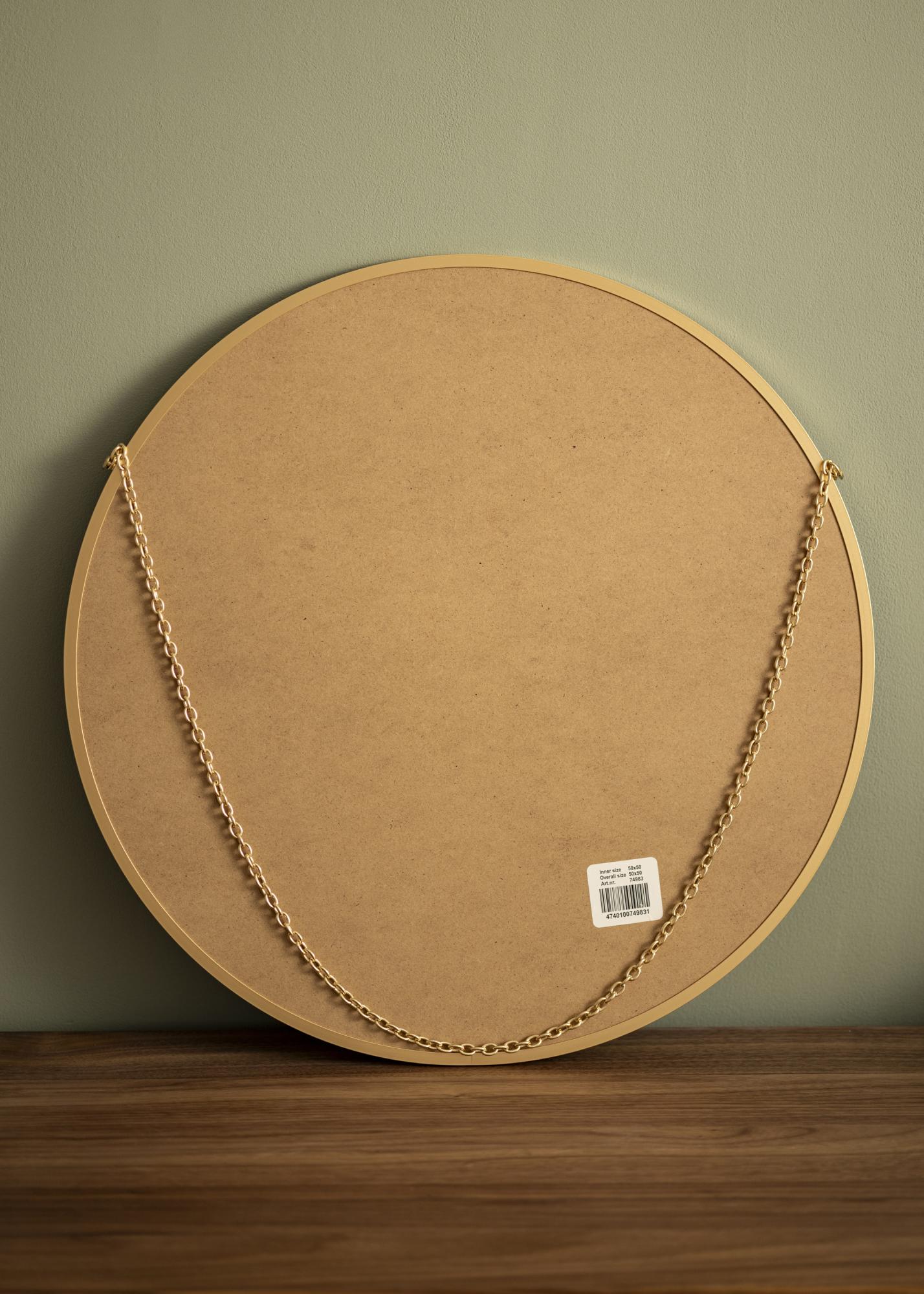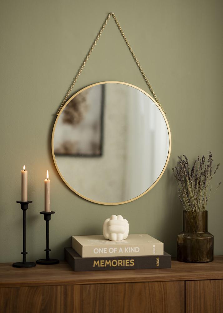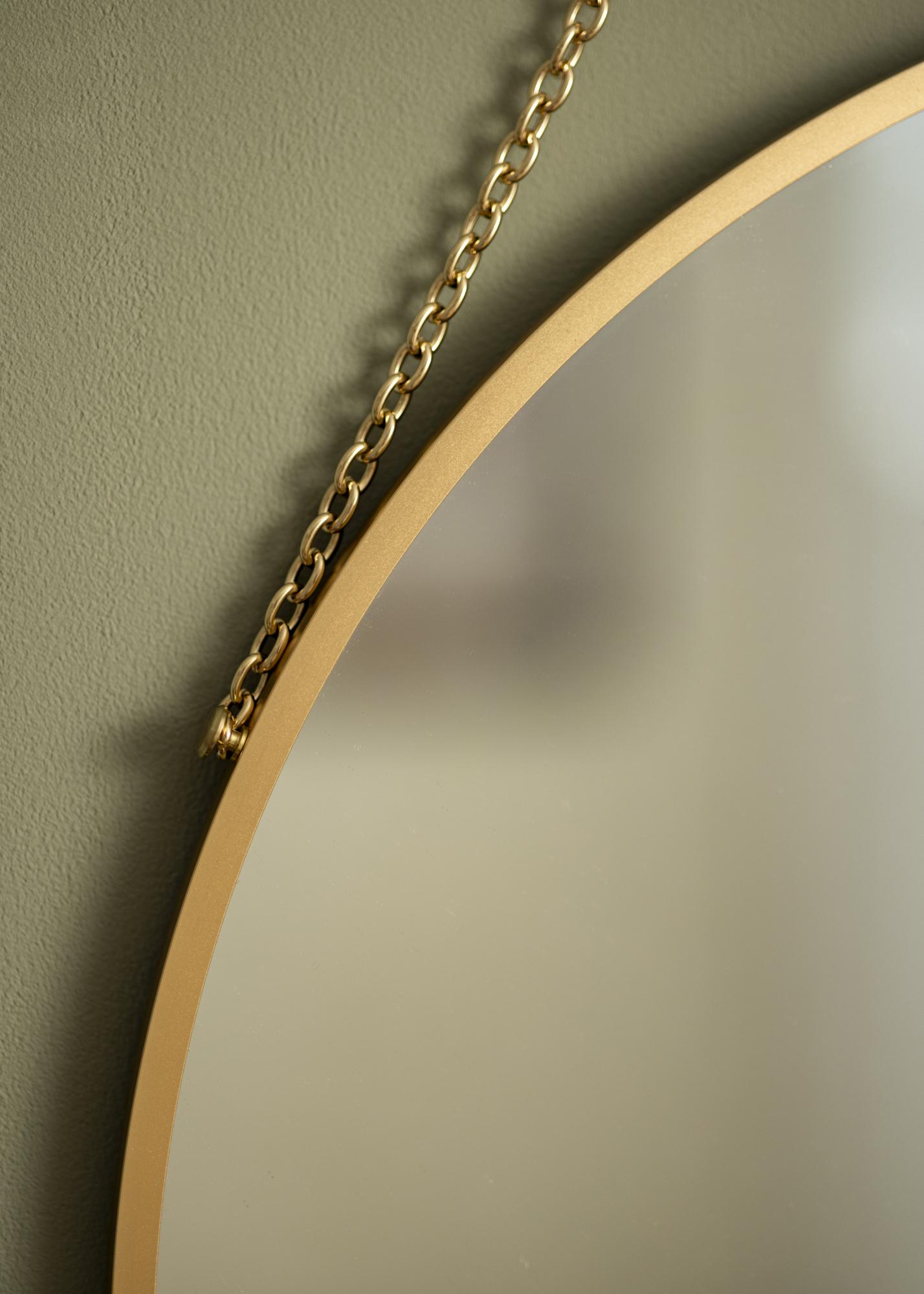 ¡Deja que este espejo de pared añada elegancia a tu hogar! El espejo tiene un aspecto sofisticado con una forma redonda y un marco de espejo fino con solo 8 mm de profundidad. El marco compacto está hecho de metal y tiene un exclusivo color dorado. La impresión elegante se completa con la cadena dorada utilizada para colgarlo.