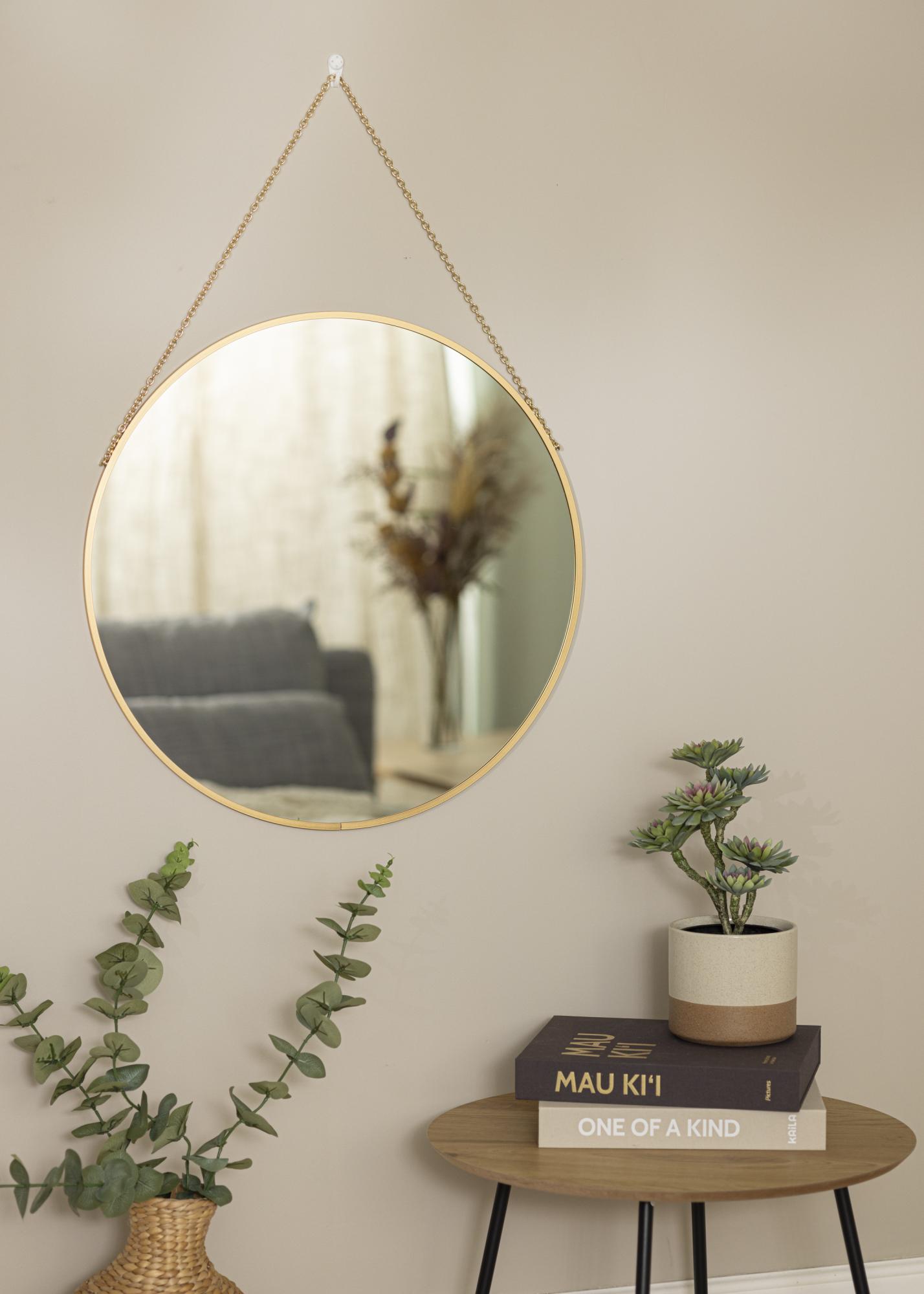 ¡Deja que este espejo de pared añada elegancia a tu hogar! El espejo tiene un aspecto sofisticado con una forma redonda y un marco de espejo fino con solo 8 mm de profundidad. El marco compacto está hecho de metal y tiene un exclusivo color dorado. La impresión elegante se completa con la cadena dorada utilizada para colgarlo.