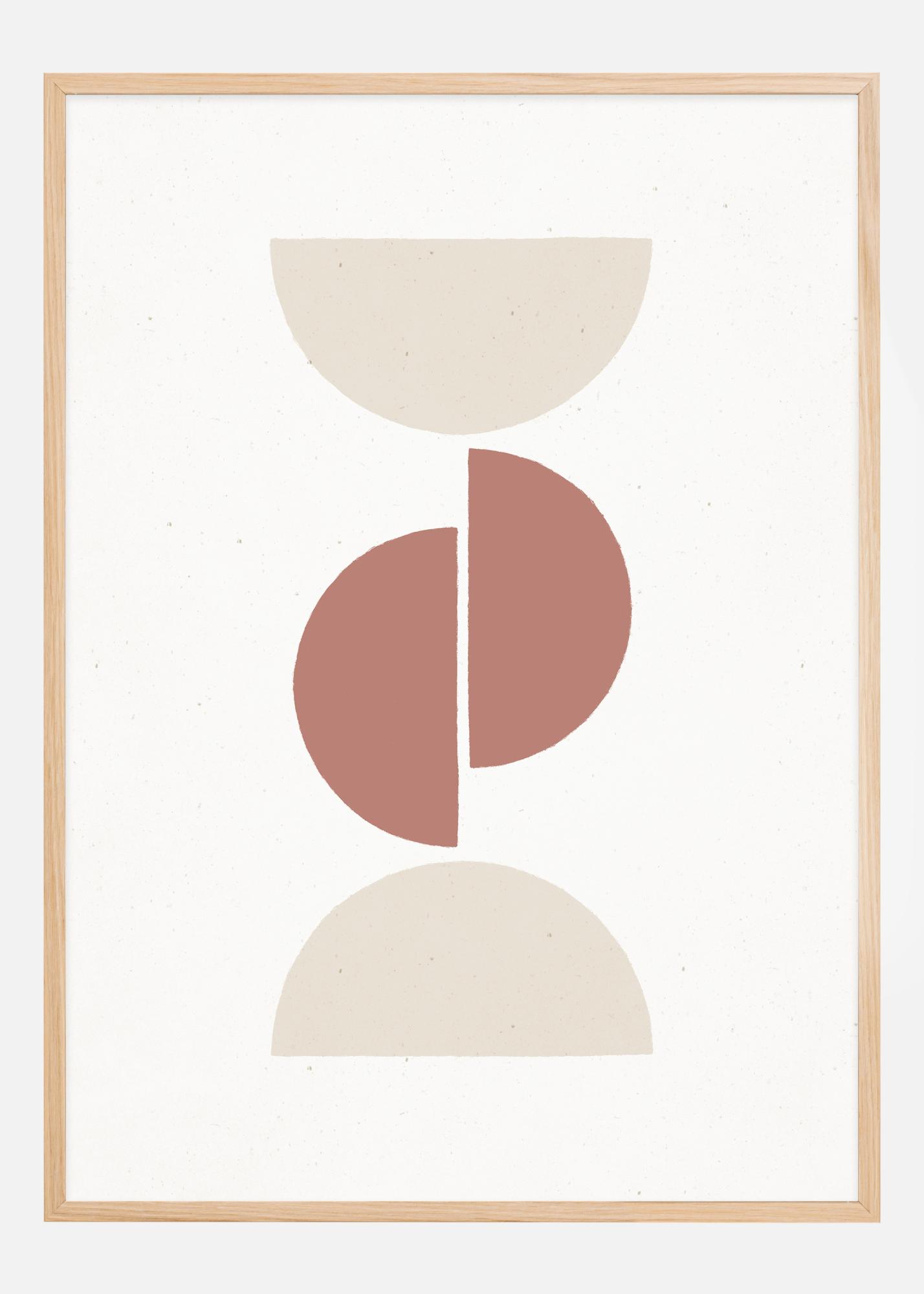 Este cartel artístico, titulado 'Rust and Sand - Geo', muestra una composición de formas geométricas abstractas en un equilibrio armónico de colores terrosos. El diseño combina medias lunas y segmentos de círculos en tonos rojos oxidados y arenosos que se destacan mutuamente y crean una sensación de espacio y equilibrio. Es una interpretación elegante y moderna del minimalismo geométrico que encaja perfectamente en una decoración escandinava o contemporánea.