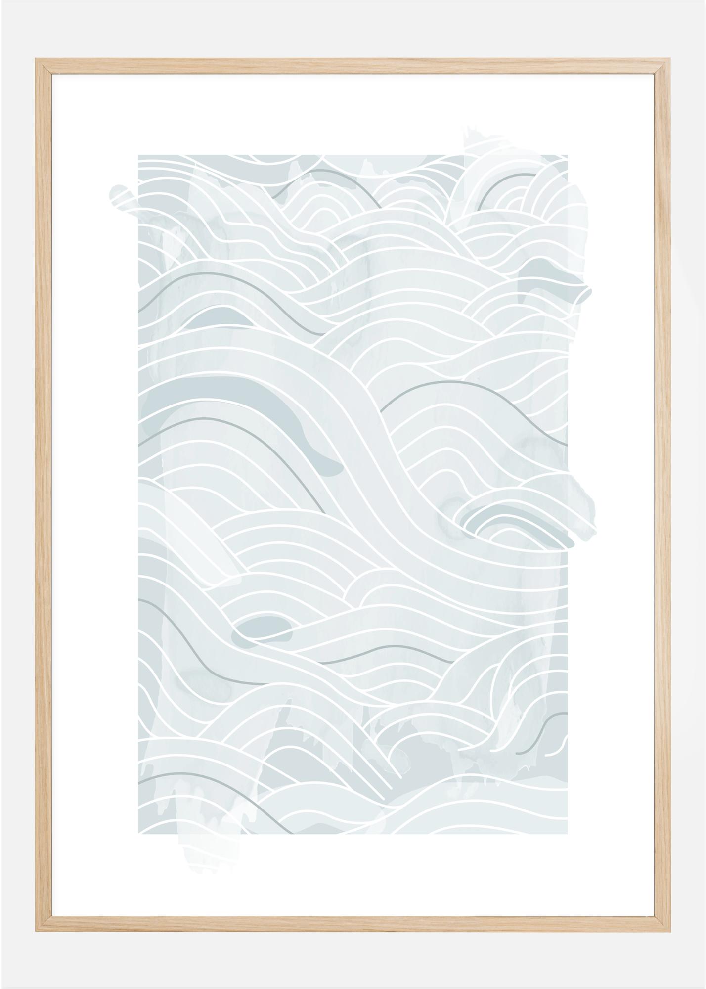 Un póster marino con suaves líneas abstractas y olas en tonos azules sobre un fondo blanco. Diferentes tonalidades de azul y grosores de línea se combinan para crear estas ondas fluidas en toda la página. Deja que tu mente se soporterda y déjate llevar por este suave diseño marino.