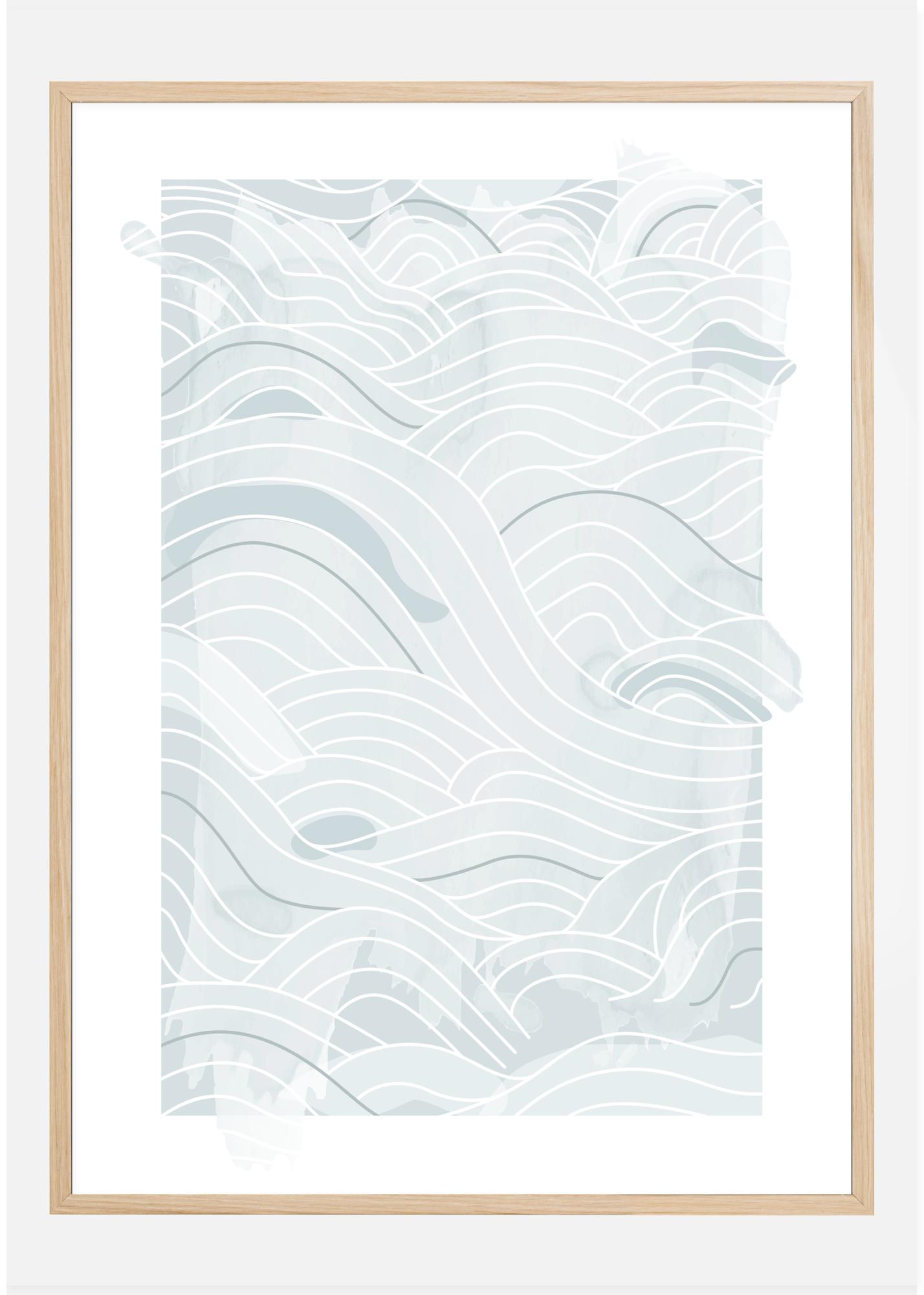 Un póster marino con suaves líneas abstractas y olas en tonos azules sobre un fondo blanco. Diferentes tonalidades de azul y grosores de línea se combinan para crear estas ondas fluidas en toda la página. Deja que tu mente se soporterda y déjate llevar por este suave diseño marino.