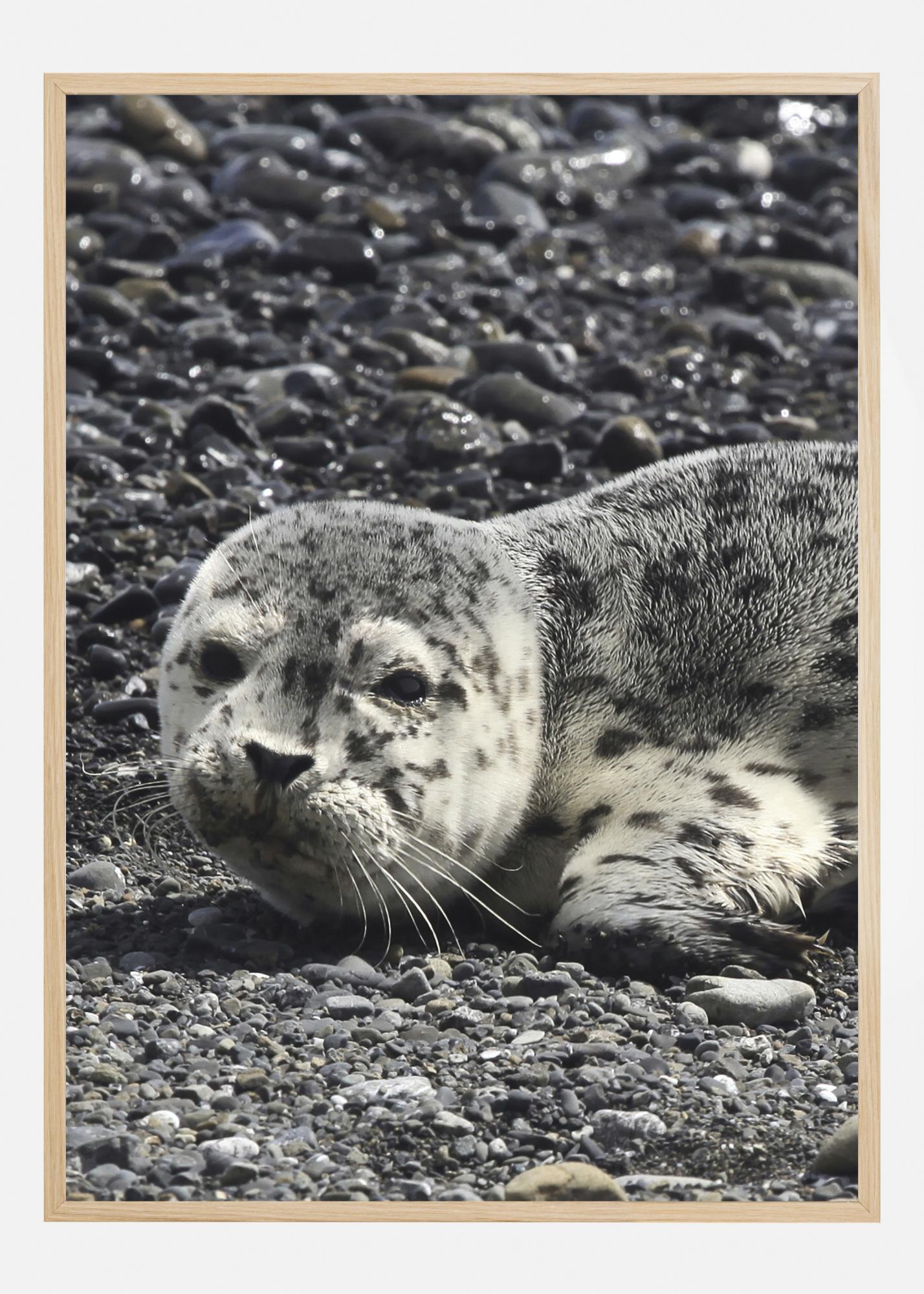 Un hermoso póster de animales con una foca en una playa rocosa. Una foca gris está acostada en las rocas, casi completamente camuflada. Las manchas en su pelaje reflejan las piedras detrás. Mira fijamente a los ojos llenos de alma de este mamífero marino mientras llevas esta imagen a casa.