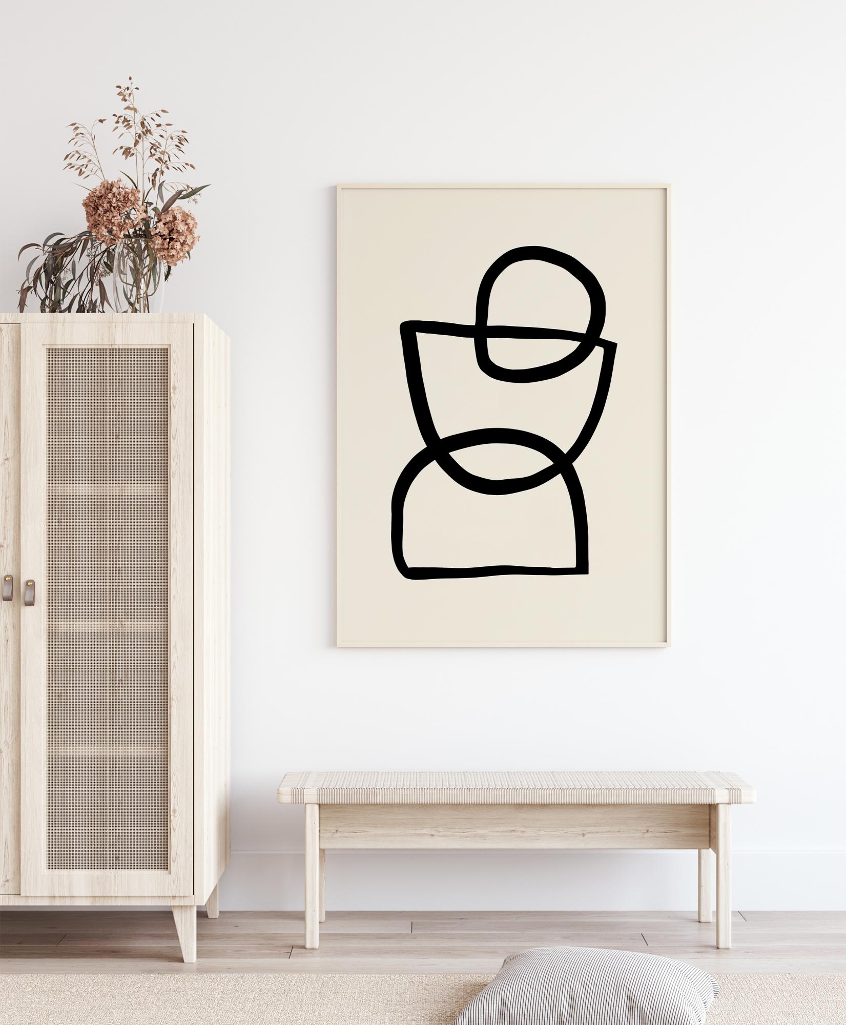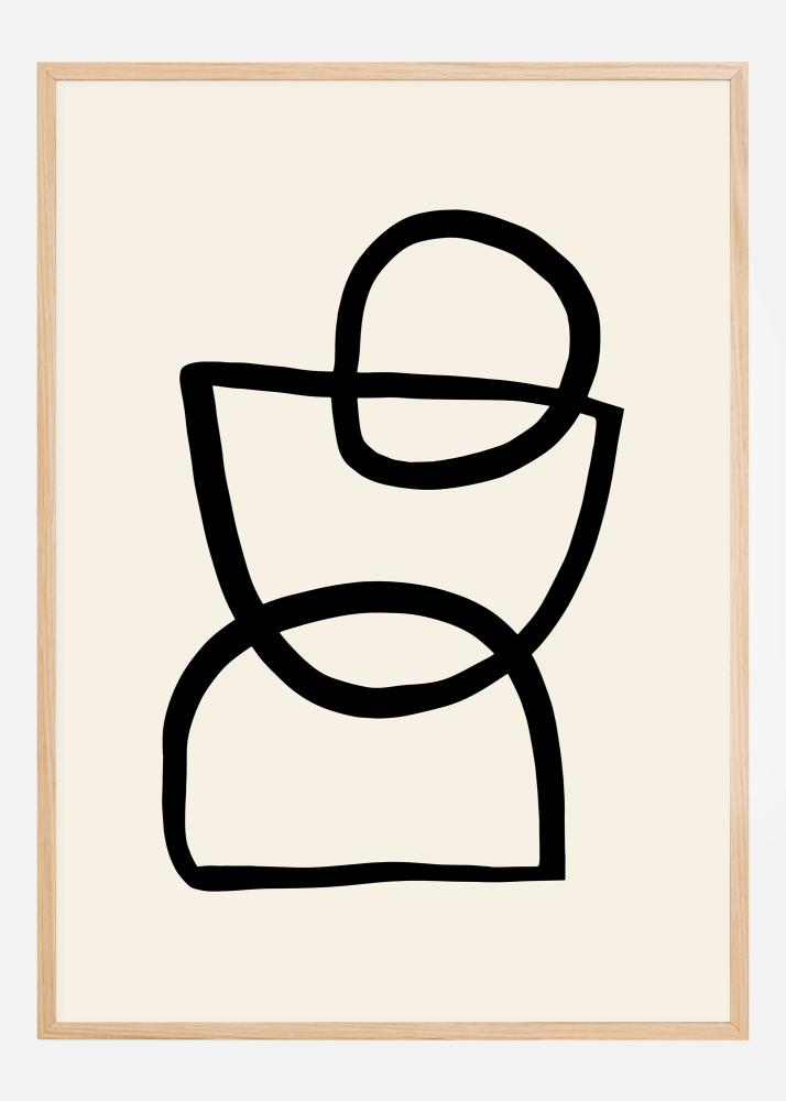 Un divertido póster abstracto con tres formas diferentes, cada una dibujada con una línea negra gruesa. Hay dos semicírculos y un círculo completo en la parte superior. Estos se superponen para crear un diseño abstracto. Cuélgalo en casa e interpreta la imagen como quieras. ¿Es una persona, un portahuevos o un reloj de arena? Eso depende de ti.