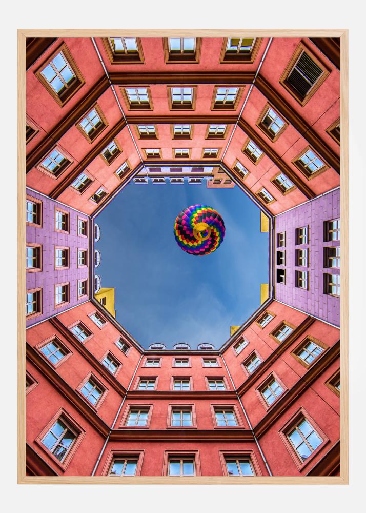 Un póster alegre en perspectiva de rana a través de edificios rosados hacia el cielo azul claro. Los edificios forman un hexágono cuando miras más allá de todas las ventanas. En el centro del cielo azul hay un globo de colores del arco iris flotando sobre la abertura. Déjate llevar por la imaginación con esta imagen brillante y optimista.