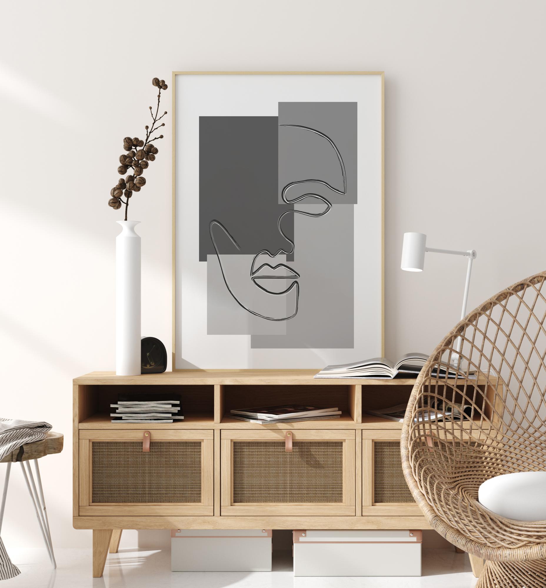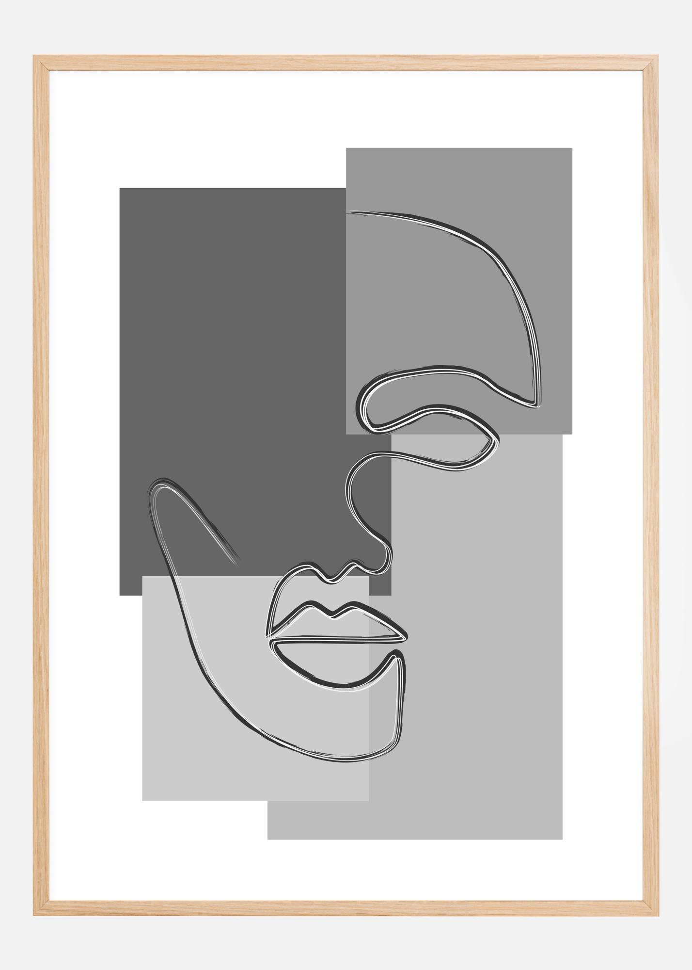 Un póster abstracto con un rostro dibujado encima de tres rectángulos de diferentes colores. Una sola línea fluida dibuja el rostro desde el ojo hasta la nariz y la boca. El rostro se encuentra encima de cuatro rectángulos, todos en diferentes tonos de gris para un aspecto más modernista.