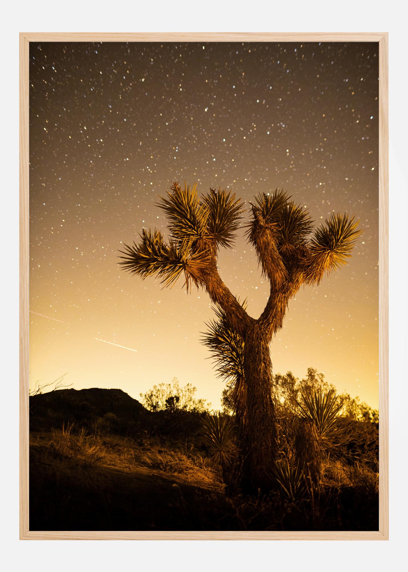 Un póster nocturno con un gran cactus en el desierto que se alza alto contra un cielo nocturno lleno de estrellas. El cactus se baña en una suave luz dorada mientras el sol se pone en el horizonte. Las estrellas parpadean suavemente en el cielo en un ambiente cálido y suave. Disfruta del calor en este cielo nocturno del desierto.