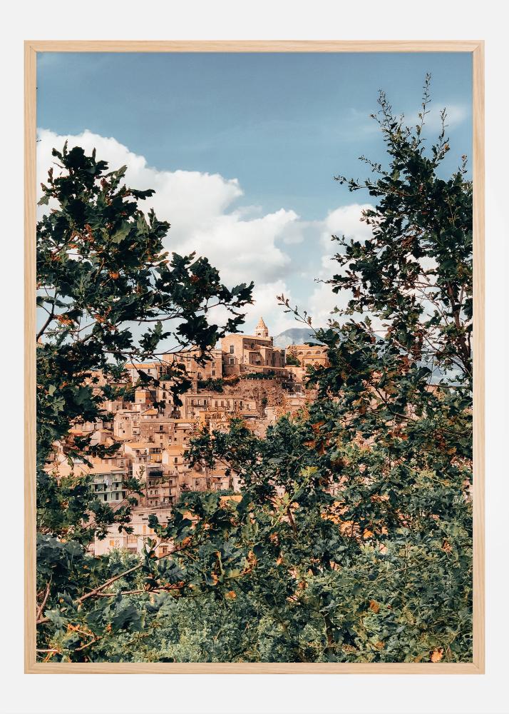 Este póster detallado capta la atención con una vista vibrante de una ciudad medieval que asciende hacia un cielo de nubes y azul. La ciudad, situada en el corazón de Sicilia, es rica en historia y cultura, lo que se refleja en los edificios de tonos cálidos y las torres de las iglesias históricas. Rodeada de un follaje verde, este póster proporciona una sensación de descubrir una joya oculta, un lugar donde cada piedra y cada techo tiene una historia que contar.