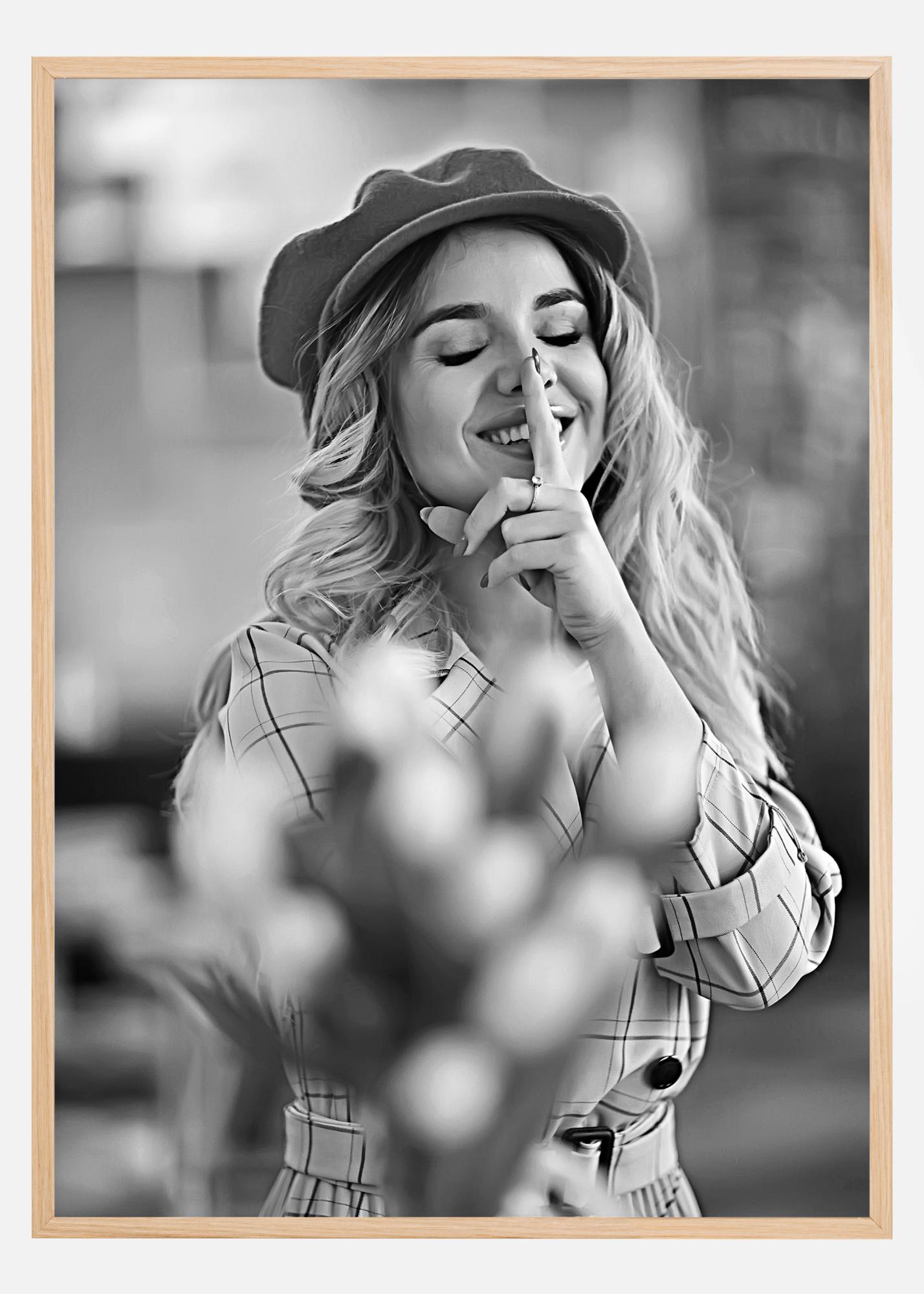 Un audaz retrato de una niña con el dedo en los labios. El cabello rubio cae debajo de su sombrero y esta linda niña sonríe ampliamente mientras levanta un dedo tranquilizador a los labios. Esta obra en blanco y negro mejorará tu estado de ánimo cada día cuando te dessoportertes y la veas.