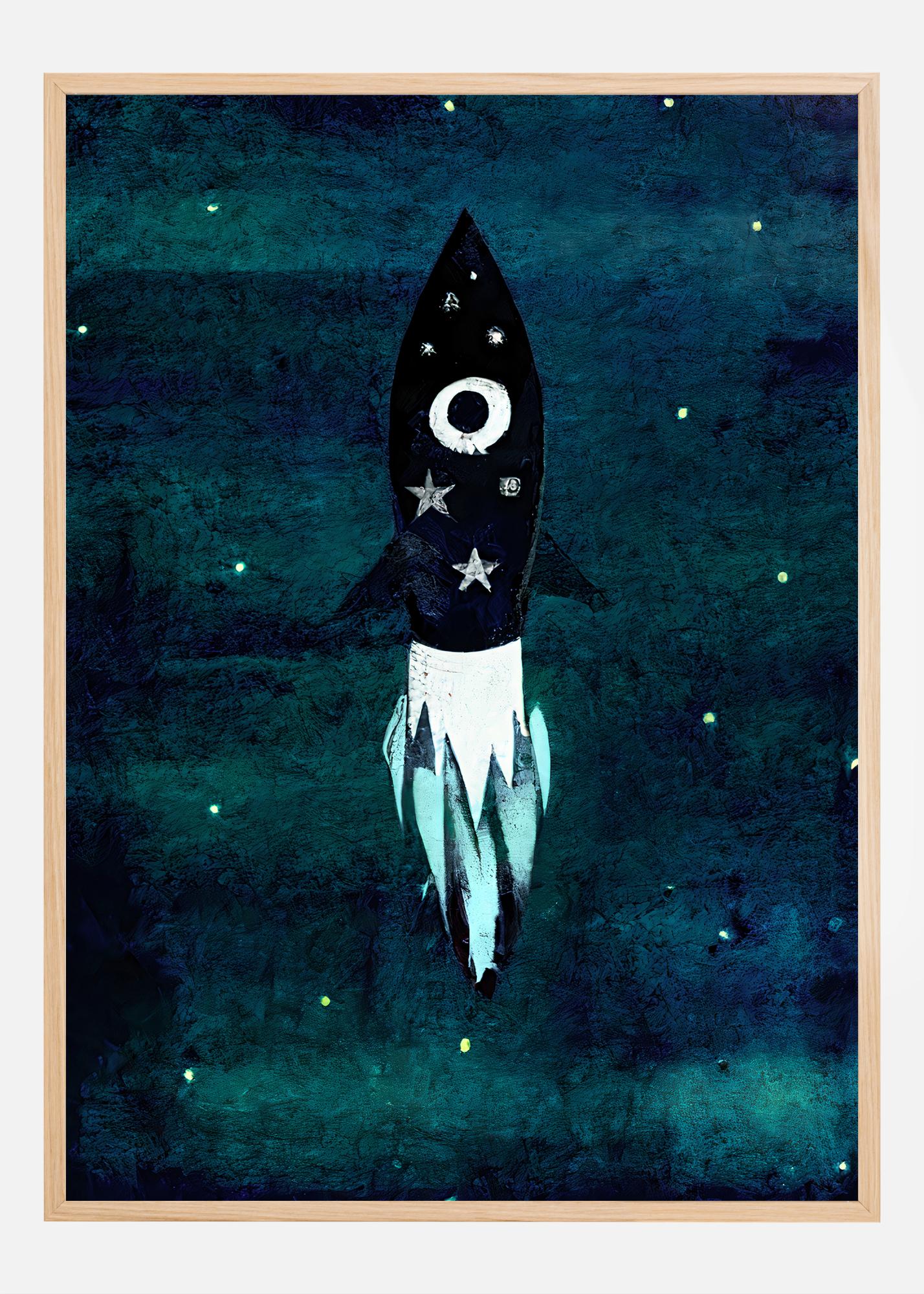 Destaca una fantasía estrellada con este cartel, que representa un cohete en un viaje de descubrimiento a través de un cosmos lleno de color. El fondo azul profundamente saturado está salpicado de puntos de luz que asemejan estrellas y dan la ilusión de un espacio infinito. El cohete en sí, decorado con estrellas plateadas y la luna, se convierte en un símbolo del sueño de la humanidad de viajar por el espacio y explorar lo desconocido.