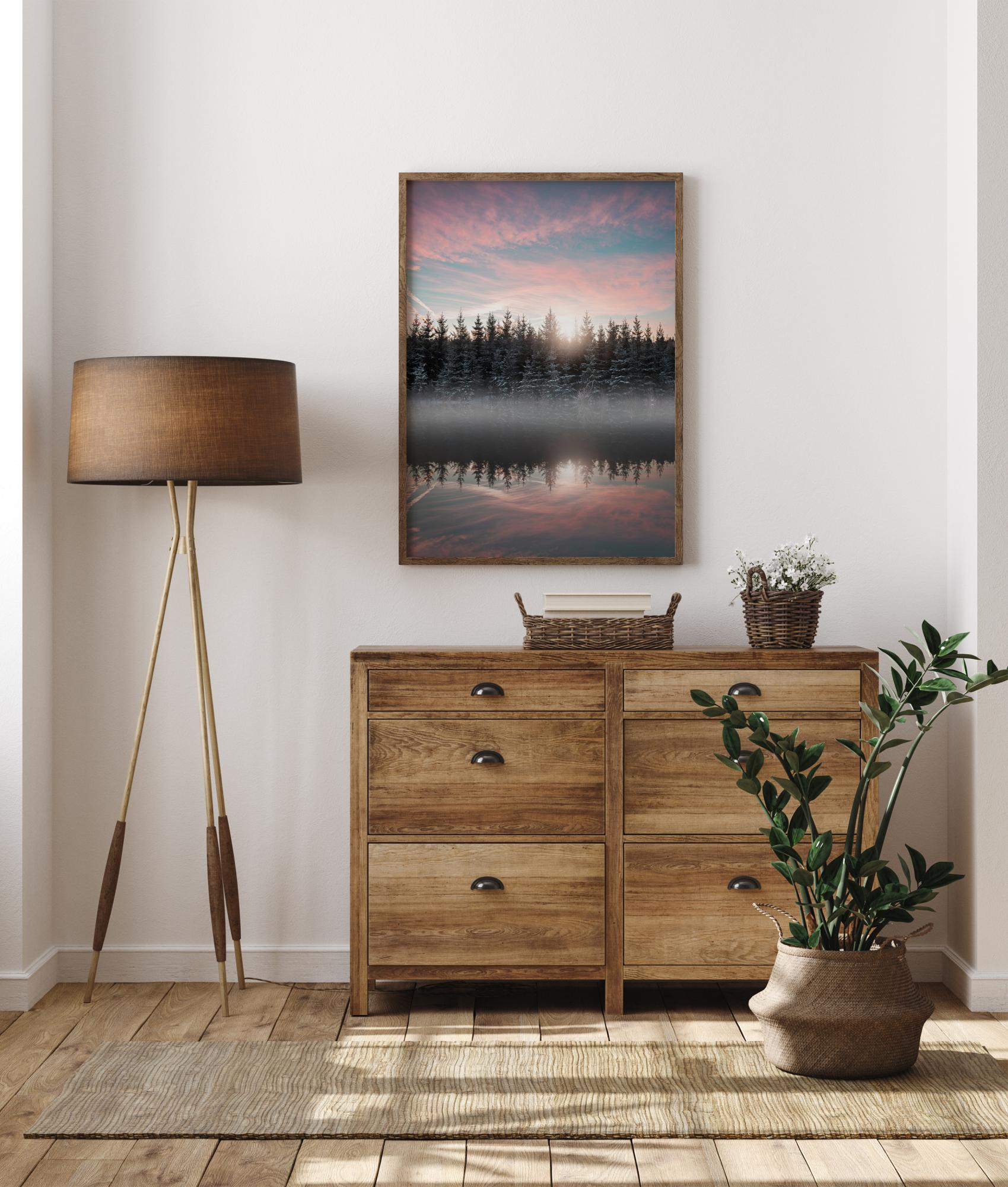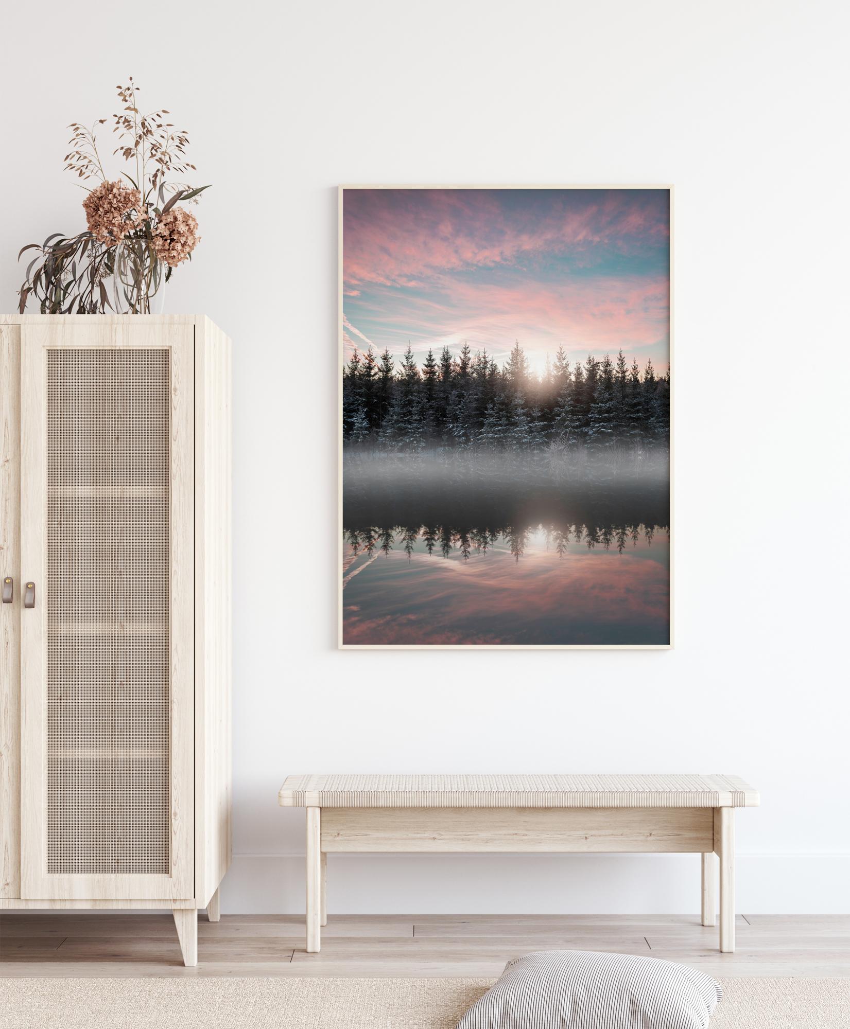 Un póster mágico con un lago cubierto de niebla en la luz temprana de la mañana. Árboles cubiertos de nieve se encuentran en la orilla, parcialmente cubiertos de niebla. Los árboles se reflejan en los suaves colores pastel del lago. Por encima de las copas de los árboles, el sol se eleva y arroja una suave luz sobre el cielo rosa y azul para crear una atmósfera tranquila.