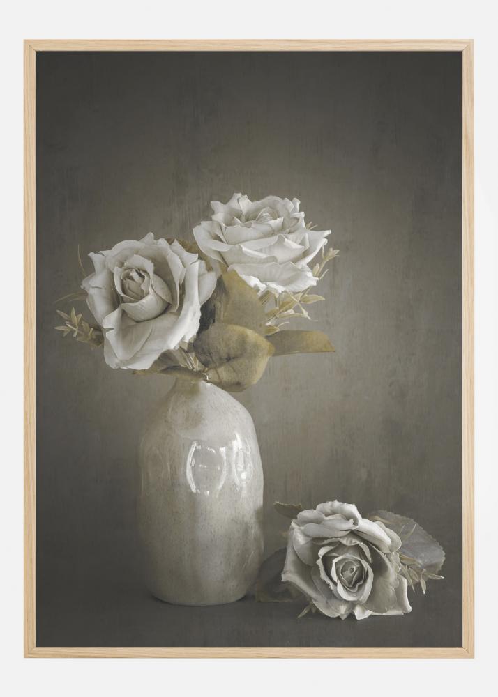 Un sencillo póster con rosas pintadas en un jarrón. Dos rosas blancas están en un jarrón blanco, una tercera rosa está colocada en el estante al lado. Cada rosa brilla con una luz invisible sobre un fondo suave y gris oscuro, creando una imagen elegante pero teatral.