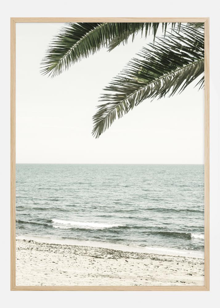 Experimenta la atmósfera pacífica de un refugio tropical con este póster que captura la vista de hojas de palma meciéndose contra un cielo azul claro y el mar tranquilo. La calmante escena de la playa está enmarcada por las vibrantes hojas verdes, creando un efecto de ventana natural e invitando al espectador a soñar con latitudes más cálidas.
