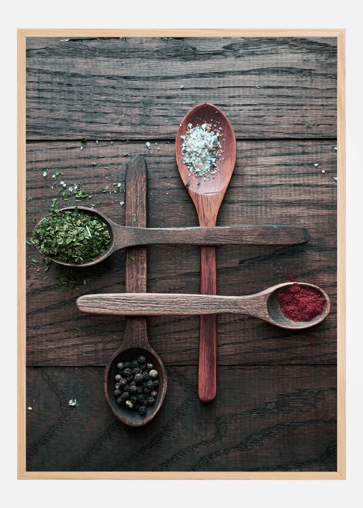 Un póster de bodegón (naturaleza muerta) con cuatro cucharas de madera, cada una de ellas contiene una especia. Las cuatro cucharas se cruzan entre sí y forman una cuadrícula en una mesa de madera rústica. Hierbas y especias se derraman de cada cuchara y crean un ambiente divertido para cocinar, perfecto para inspirar en tu cocina.