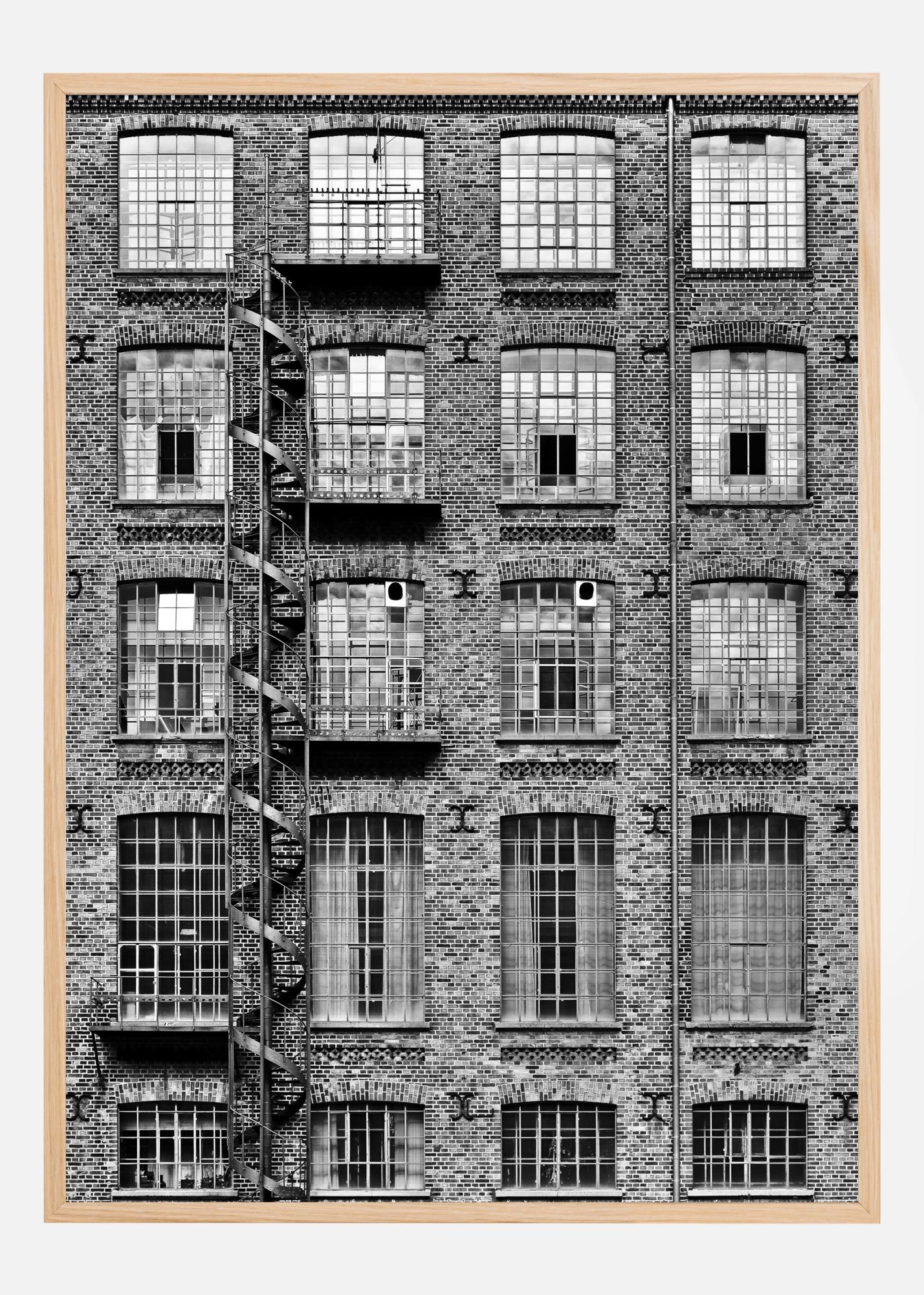 Un póster urbano que muestra la fachada de un antiguo edificio con una escalera de caracol sinuosa. Las dramáticas ventanas cuadradas contrastan con las curvas de la escalera. Esta impresión combina perfectamente con formas geométricas.