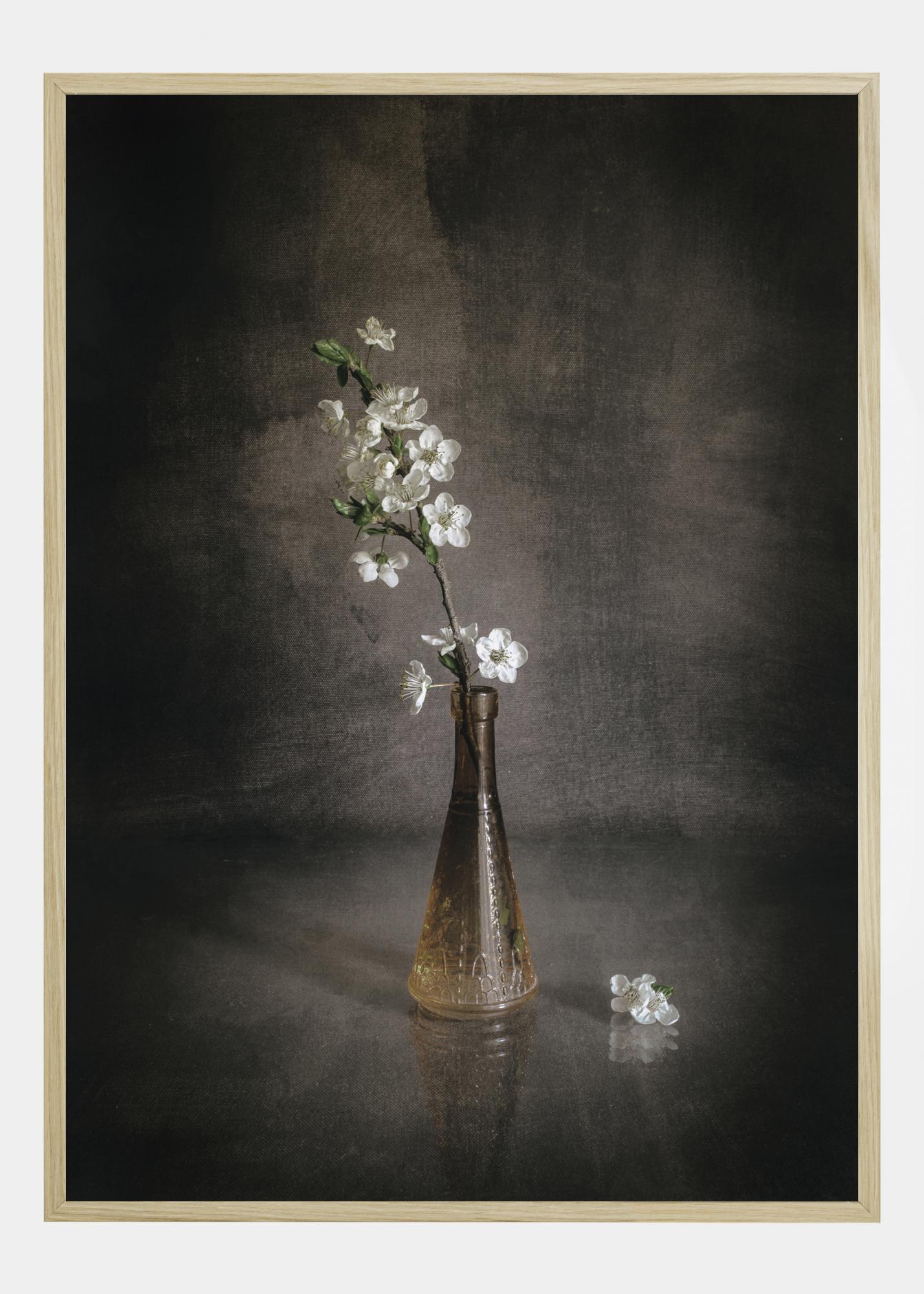 Un póster de primavera con flores blancas en un fino jarrón marrón. El jarrón proyecta sombras en dos direcciones y crea un punto focal luminoso donde las flores en forma de estrella crecen hacia los amplios trazos de pincel marrón oscuro en la pared detrás. Contempla esta elegante bodegón (naturaleza muerta).