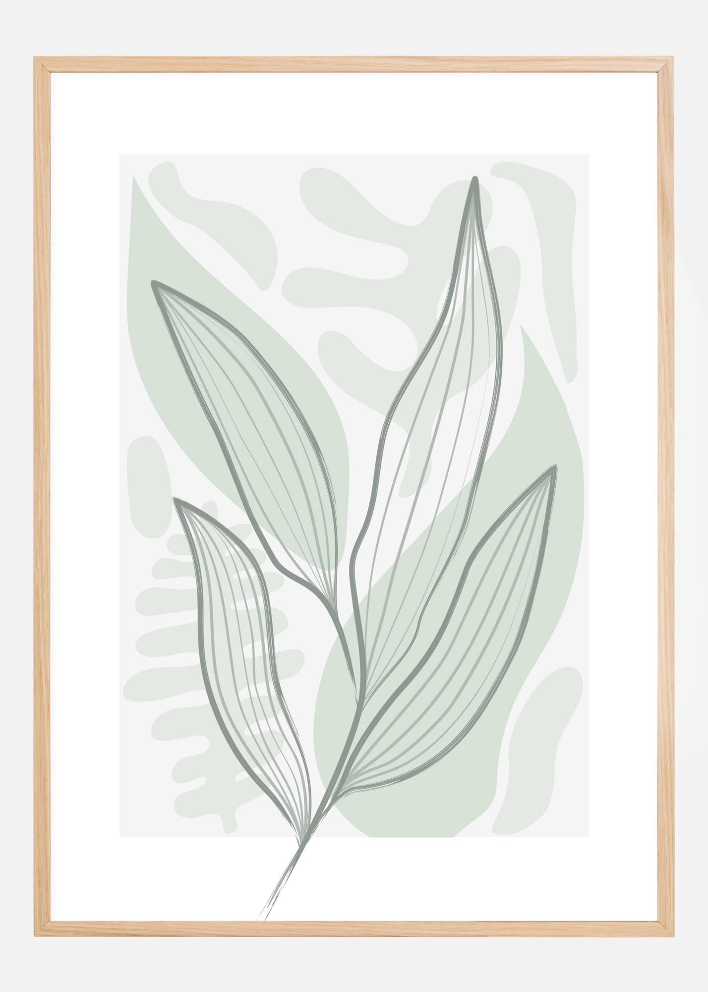 Un póster abstracto con hojas sobre un fondo verde sencillo con diferentes formas y patrones de hojas. Con colores suaves de verde y gris, el diseño sencillo de las hojas, delimitado por una línea gris fuerte, brinda una sensación fuerte pero suave de primavera que se puede colgar en cualquier habitación del hogar.