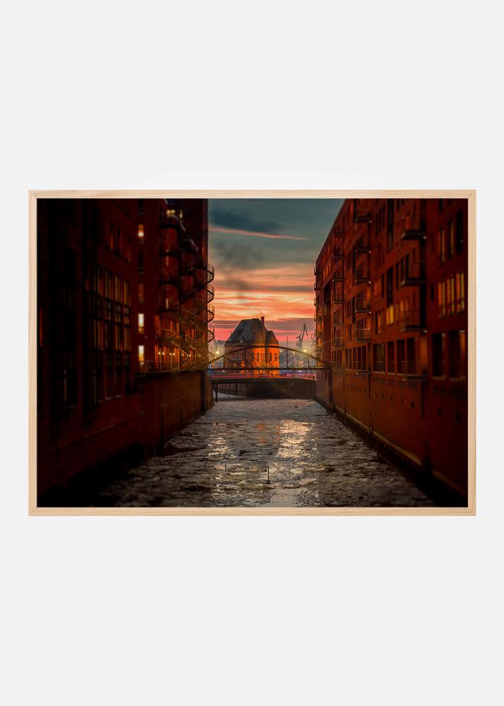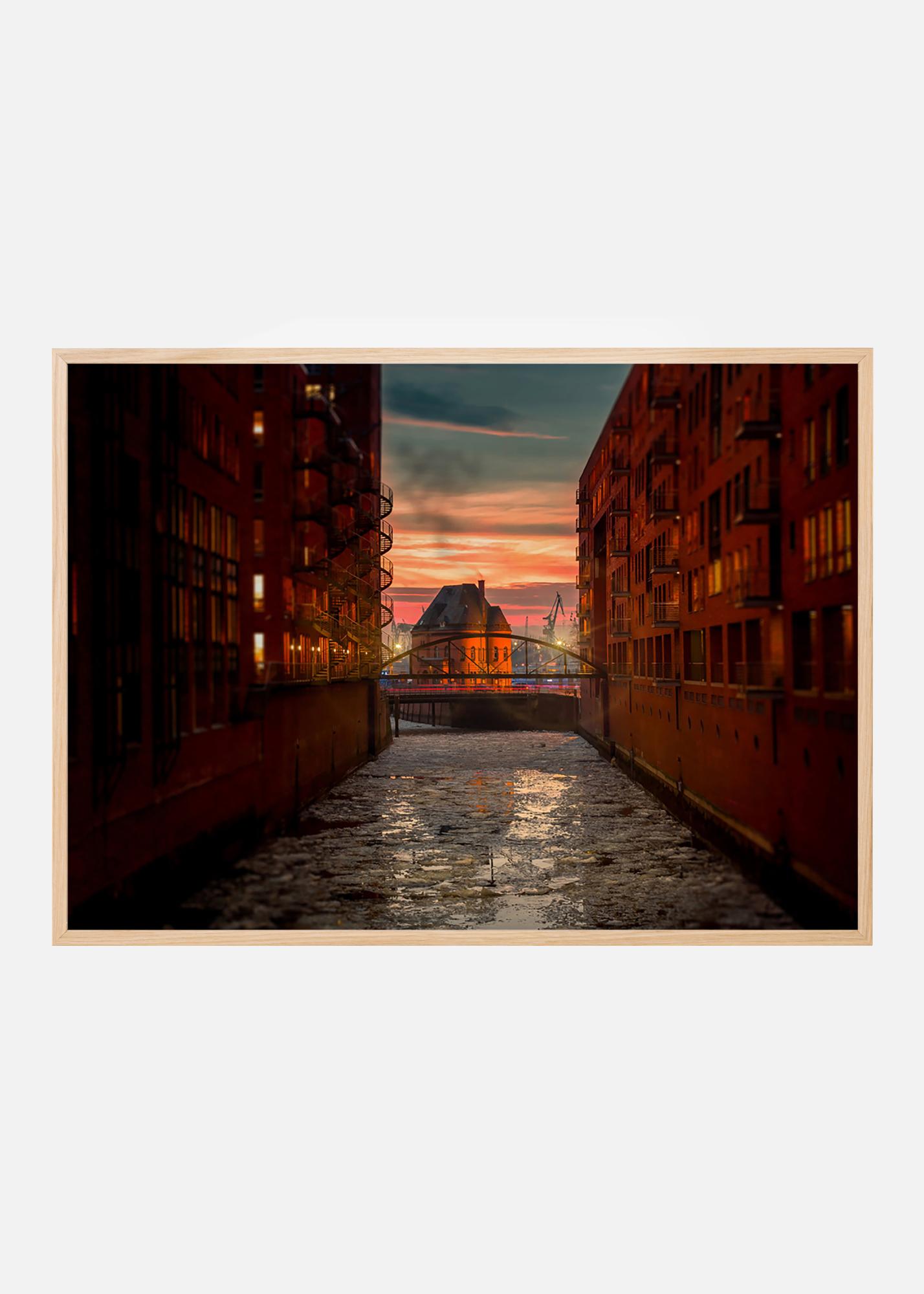 Puesta de sol sobre el antiguo distrito de almacenes Speicherstadt en Hamburgo, con sus canales y edificios de ladrillo neogótico. La fotografía de esta zona protegida por su valor histórico encaja perfectamente en el hogar de aquellos interesados en la arquitectura o la historia. El póster se ve mejor en un marco de metal fino que combine con la arquitectura sobria y se vea elegante en la pared junto con otras imágenes de la ciudad.