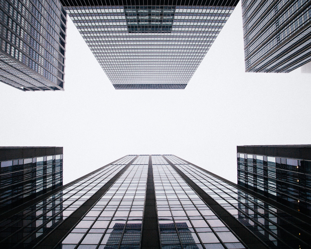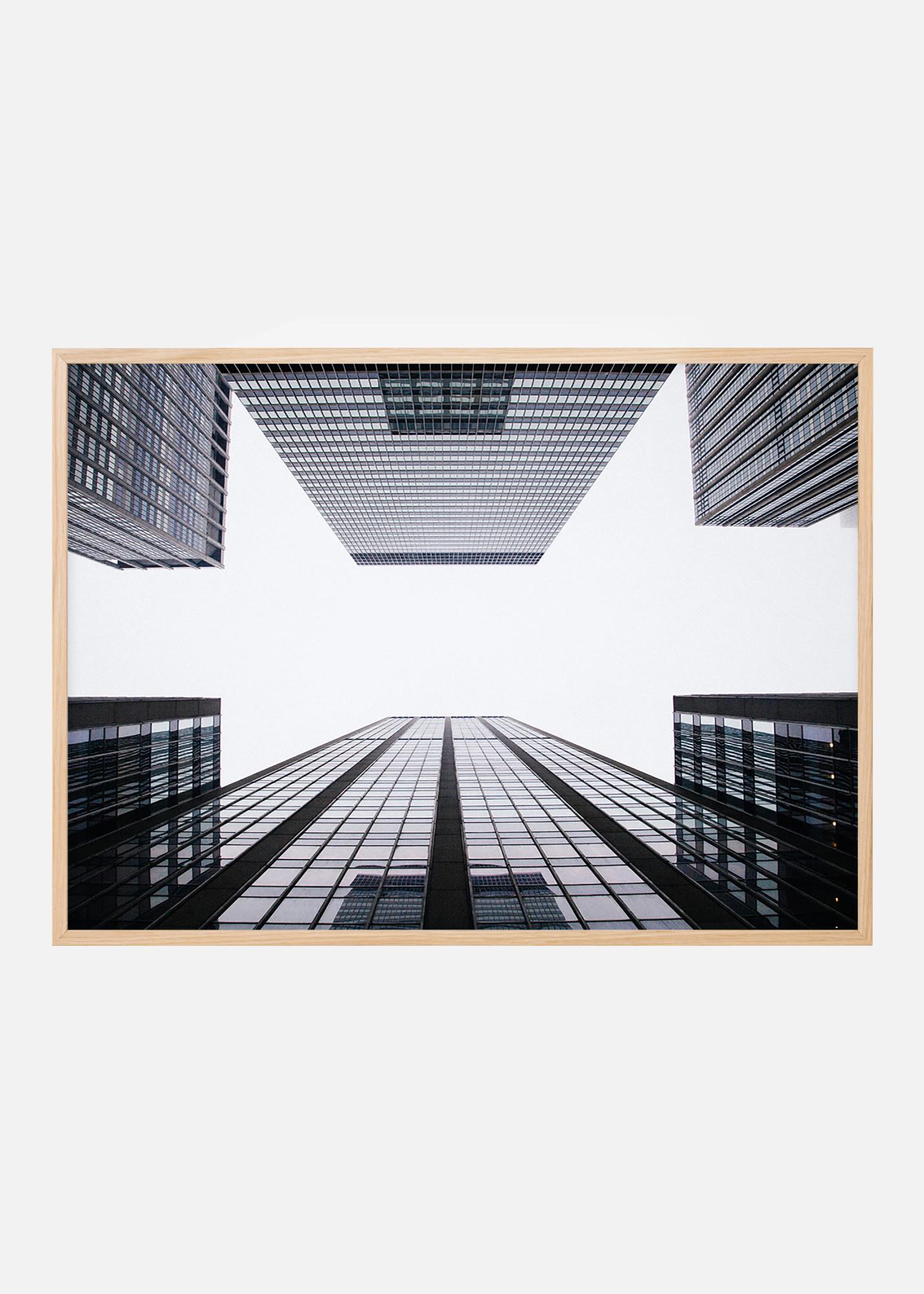 Póster de arquitectura con rascacielos en crecimiento hacia un cielo blanco como las nubes. Imagen elegante de edificios oscuros sobre un fondo blanco, con reflejos del cielo en los cristales. Un regalo perfecto para aquellos a quienes les gustan los retratos gráficos de edificios. La impresión se ve bien en un marco negro que resalta la oscuridad de la imagen y queda bien en combinación con otras fotografías de arquitectura.