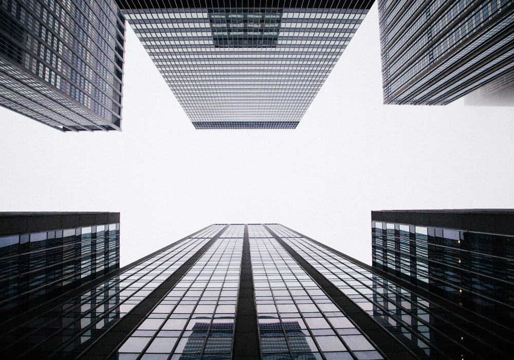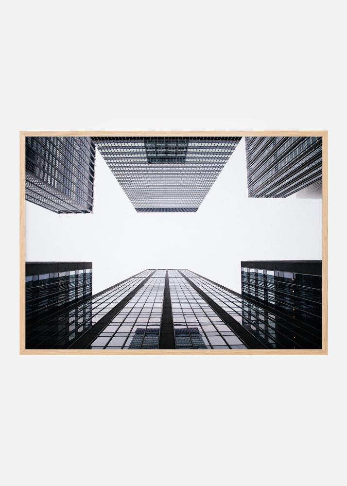Póster de arquitectura con rascacielos en crecimiento hacia un cielo blanco como las nubes. Imagen elegante de edificios oscuros sobre un fondo blanco, con reflejos del cielo en los cristales. Un regalo perfecto para aquellos a quienes les gustan los retratos gráficos de edificios. La impresión se ve bien en un marco negro que resalta la oscuridad de la imagen y queda bien en combinación con otras fotografías de arquitectura.