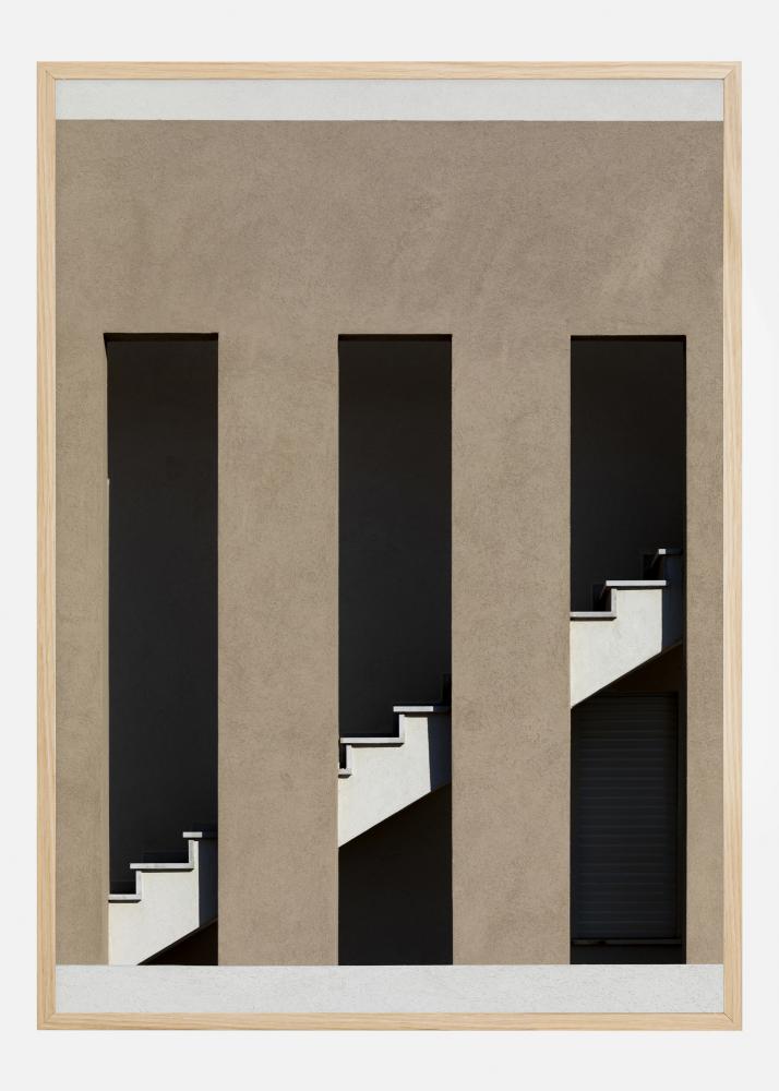 Un póster en un entorno urbano con escaleras que se elevan detrás de grandes aberturas de ventanas. Una imagen abstracta fantástica, donde las formas geométricas crean una sensación de orden en esta imagen dramática. Esta imagen le da a tu hogar un toque de arte.