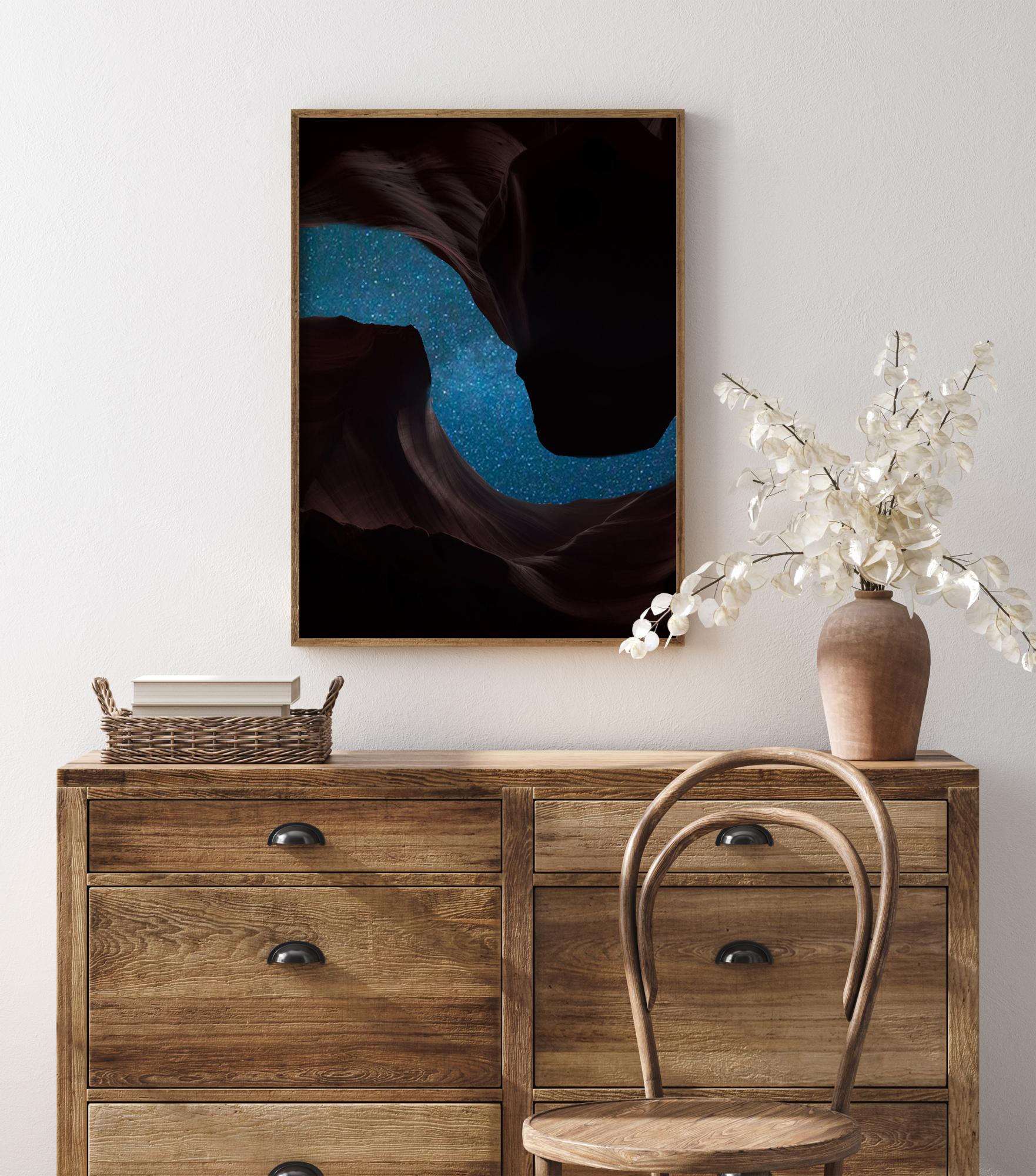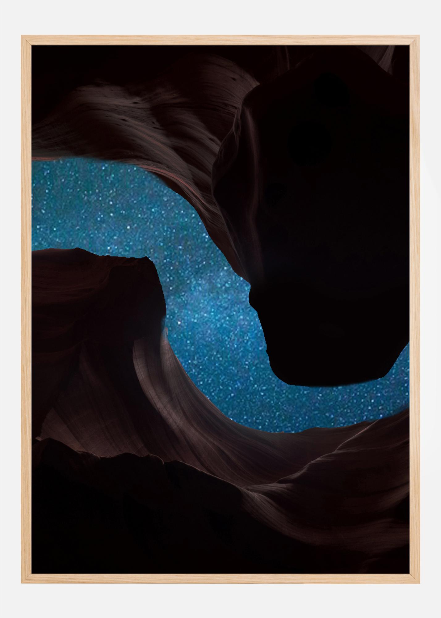 Un magnífico póster nocturno con un cielo estrellado que se asoma entre algunas formaciones dramáticas de acantilados. Los acantilados de color rojo intenso giran alrededor de la parte superior e inferior de la foto, creando un camino estrellado para que el cielo nocturno brille a través en esta imagen vívido que está diseñada para evocar reverencia.