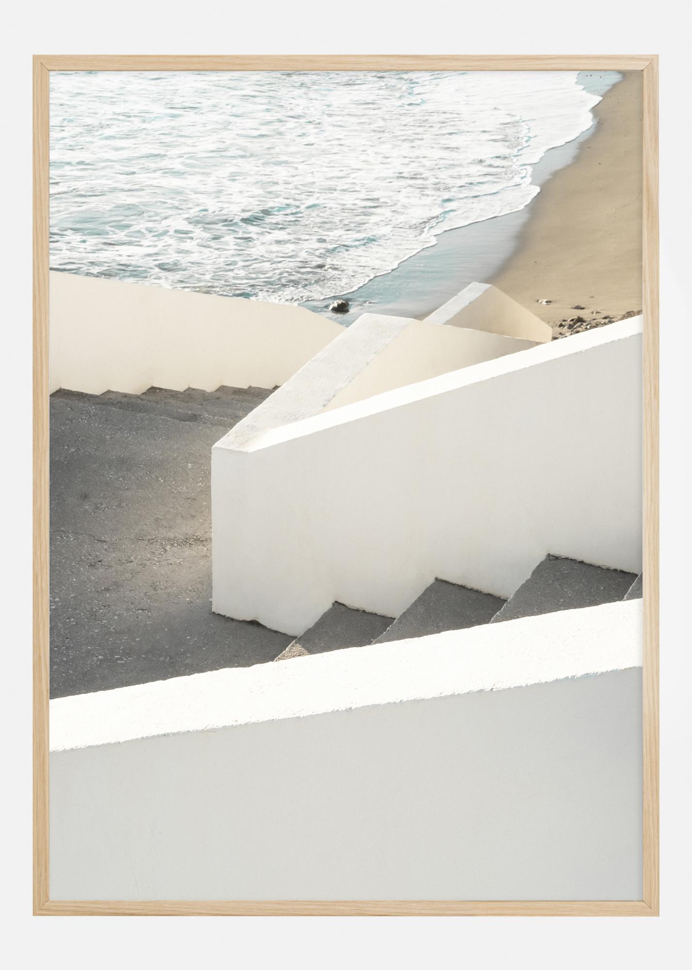 Este póster proporciona una sensación de tanto arquitectura como naturaleza al mostrar una estructura escalonada blanca que conduce a una playa tranquila y al mar sereno. El juego entre la luz y la sombra en los escalones, junto con el contraste entre la arquitectura austera y la suave línea de la playa, crea una imagen que es tanto relajante como visualmente interesante.