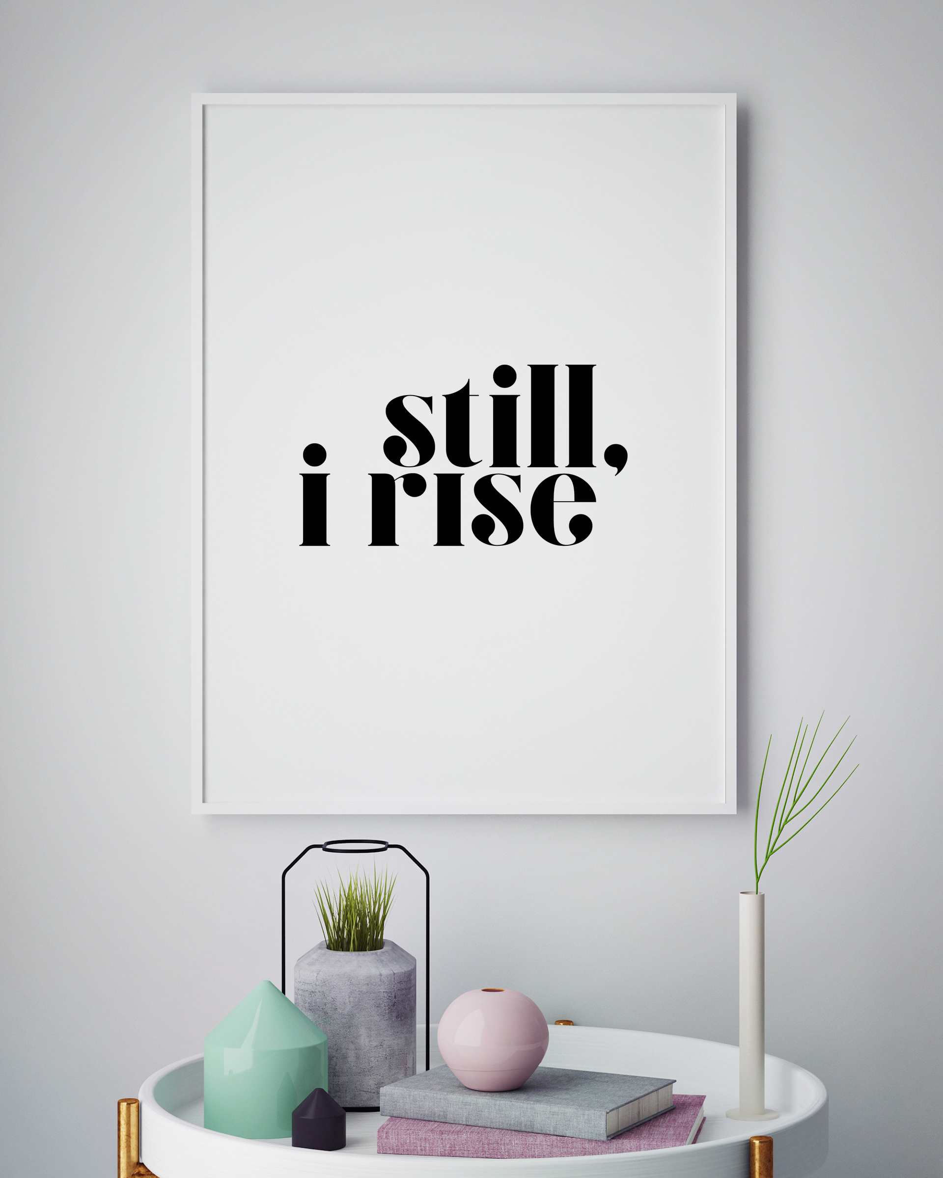 Un póster inspirador con una cita motivacional en letras negras fuertes sobre un fondo blanco común. Date el poder de seguir adelante con la frase "Still, I Rise" (Aún así, sigo levantándome), mientras tomas tu café por la mañana y planeas tu día.