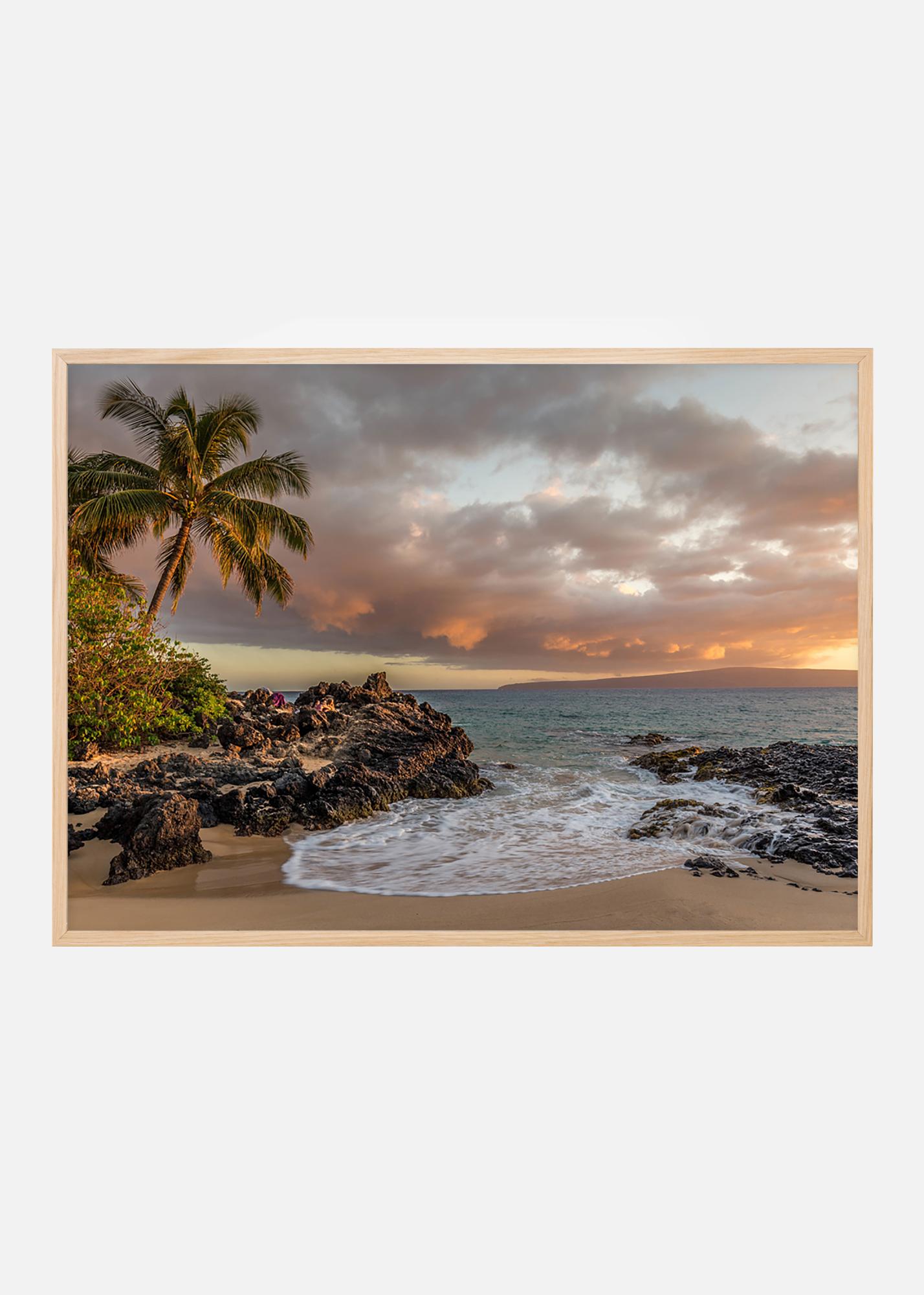 Una playa al atardecer, un cliché hermoso que es imprescindible para los amantes de Tiki o el tema tropical. Póster con la clásica palmera inclinada sobre el borde de la playa en los últimos rayos dorados del día. La fotografía se ve hermosa en un marco con un aspecto desgastado por el clima o en un color fuerte para combinar con la decoración tiki.