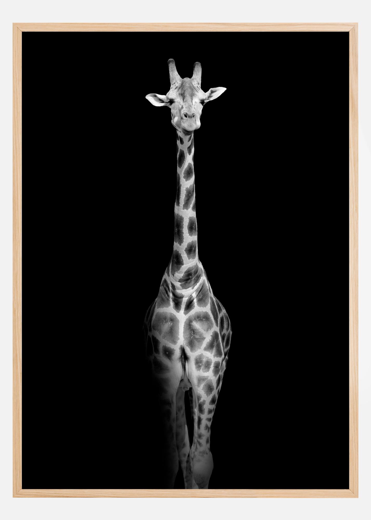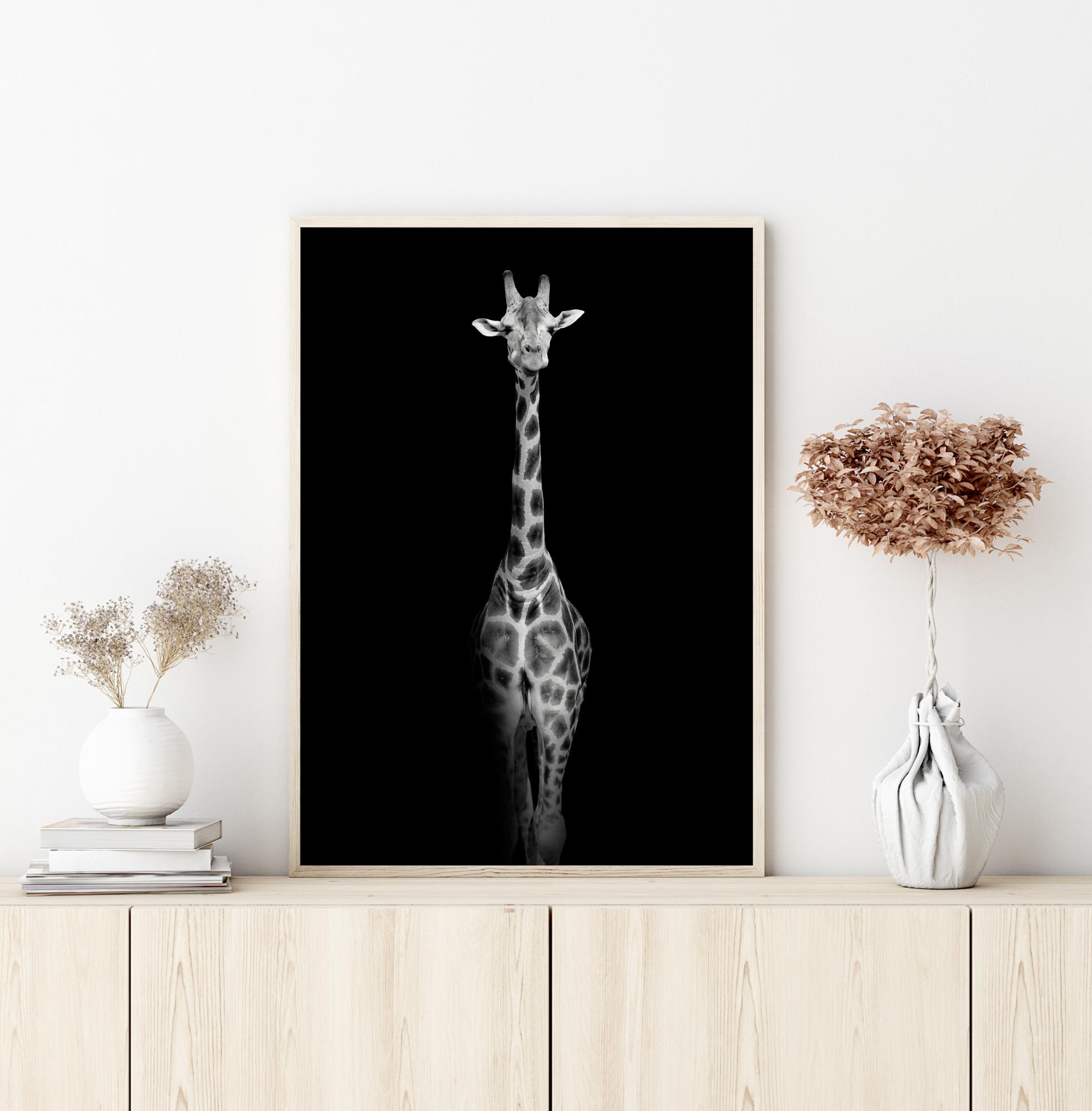 Arte fotográfico en blanco y negro de una elegante jirafa saliendo del fondo negro de la imagen. Un póster elegante y lleno de contraste con una profundidad encantadora. Combínalo con otros de nuestros hermosos pósters de animales en el mismo estilo para crear una pared temática.